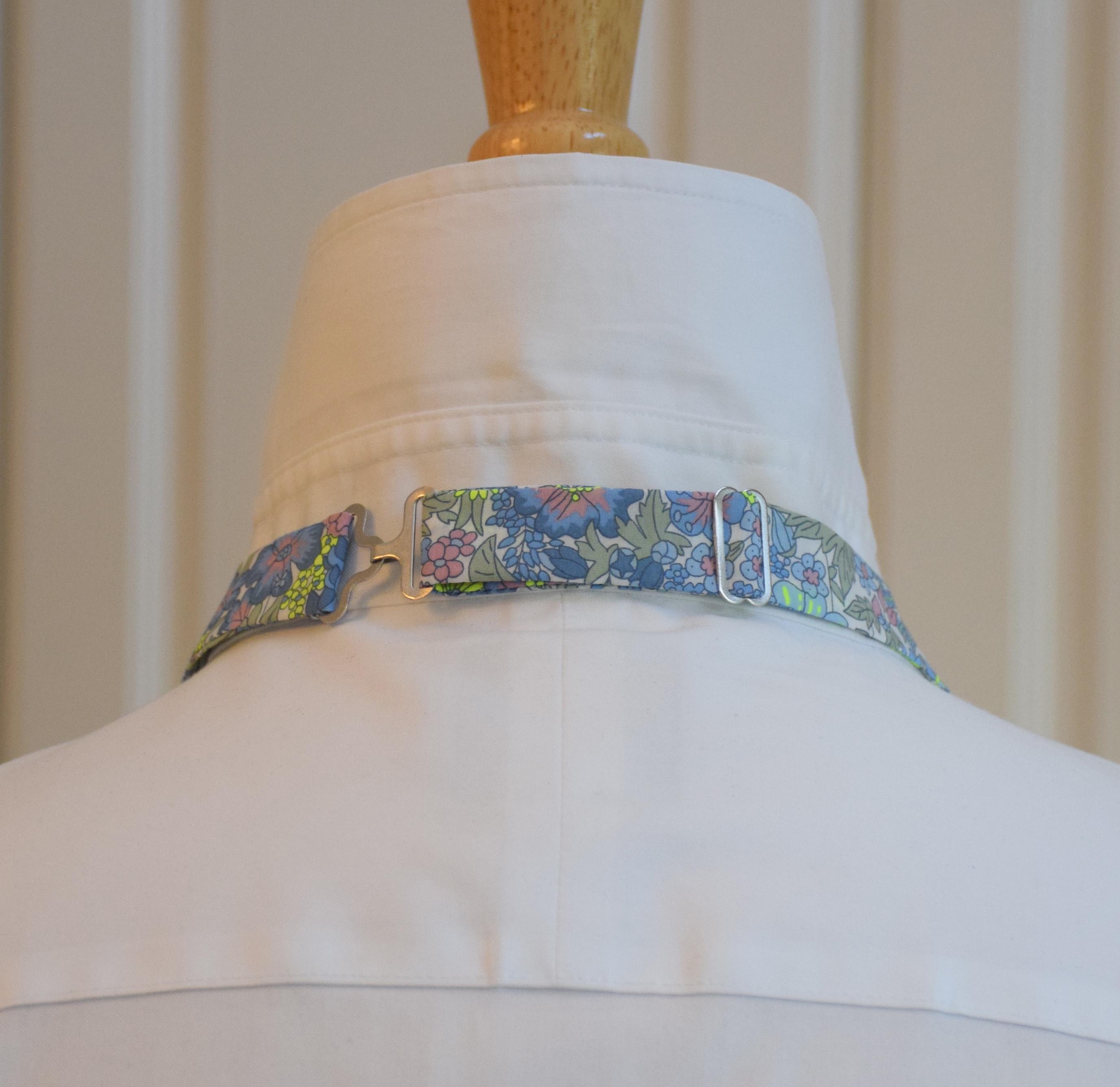 Adjustable in both pre-tied and self-tie version between 14" - 19.5". Pre-tied version has the hook and slider visible at the back (as shown in the photos) but can still be tied and un-tied. The self-tie version has a hidden internal size adjustment mechanism (T hook and sizing ribbon) and can only be tied while on the person wearing it.