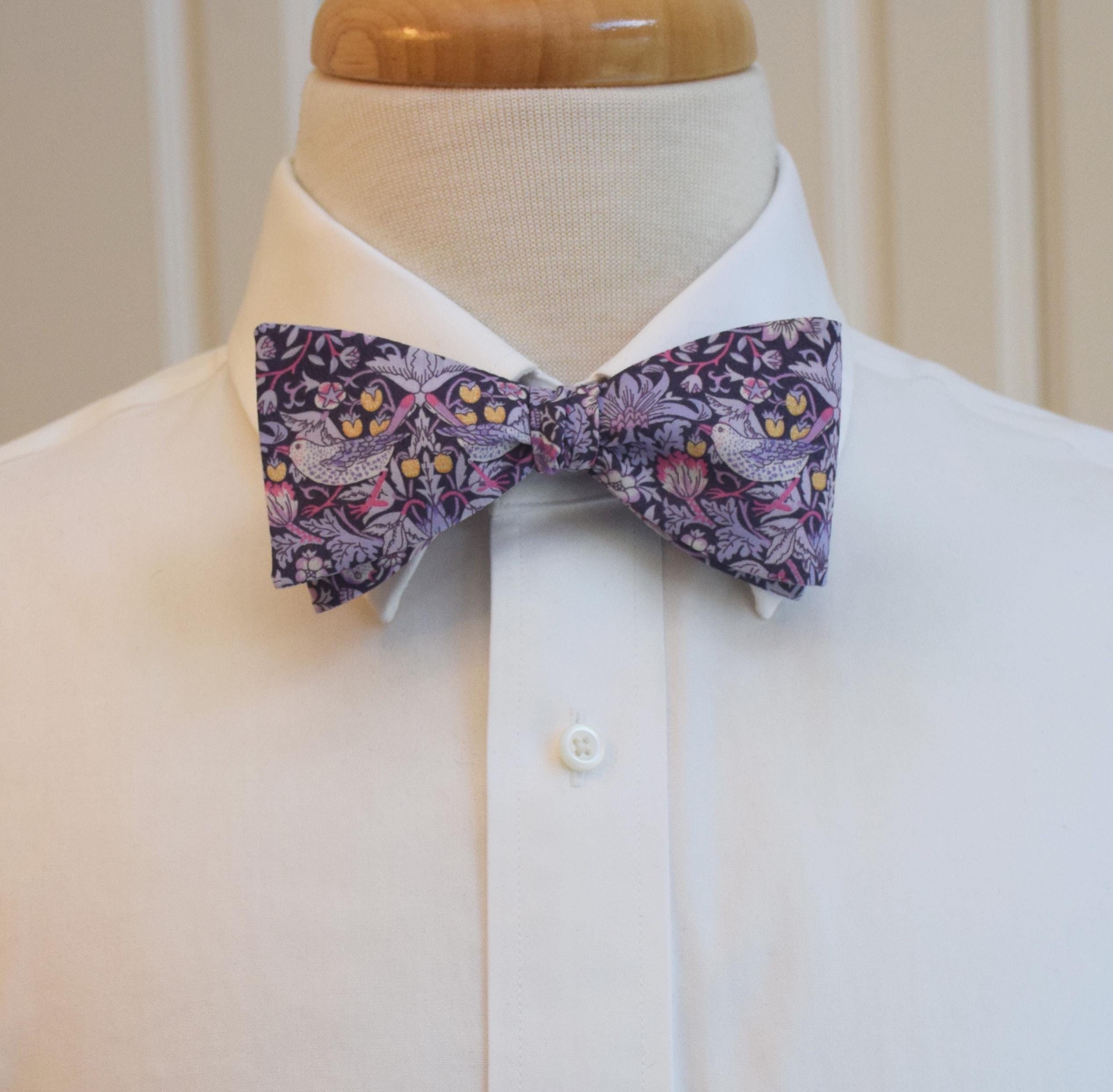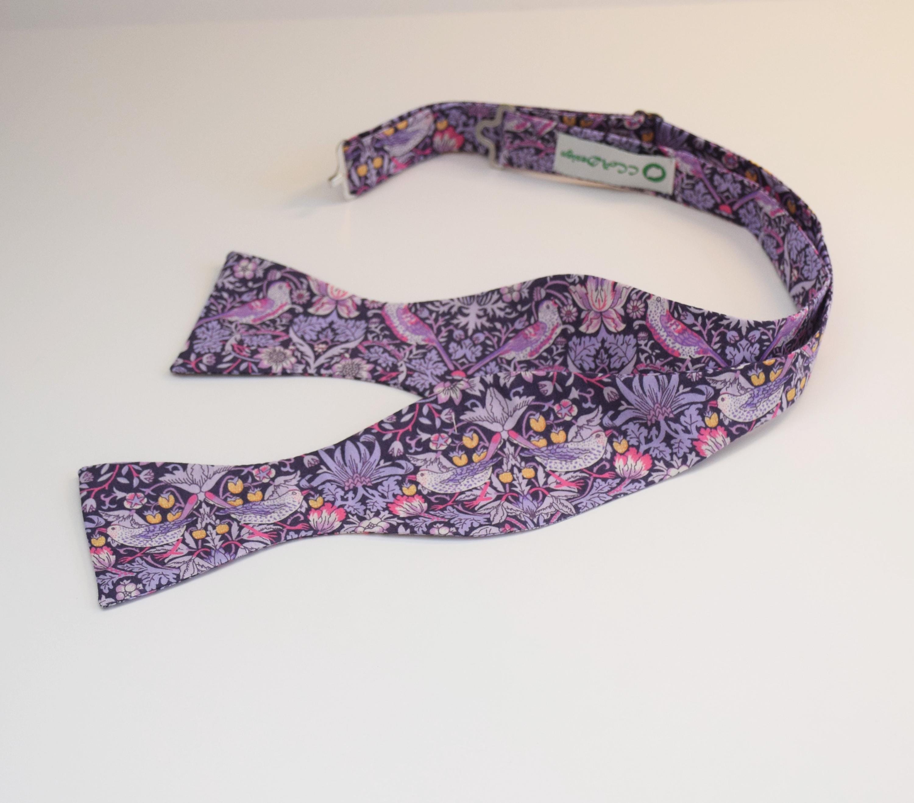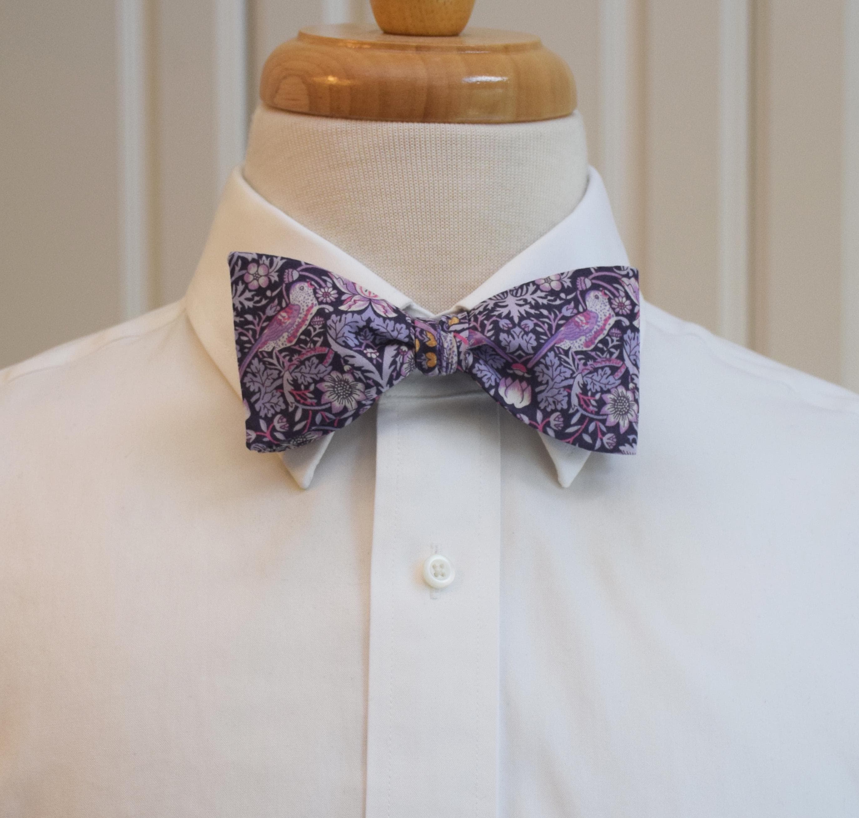 Liberty London Bow Tie: William Morris Strawberry Thief, amethyst, purples, hot pink with gold accents