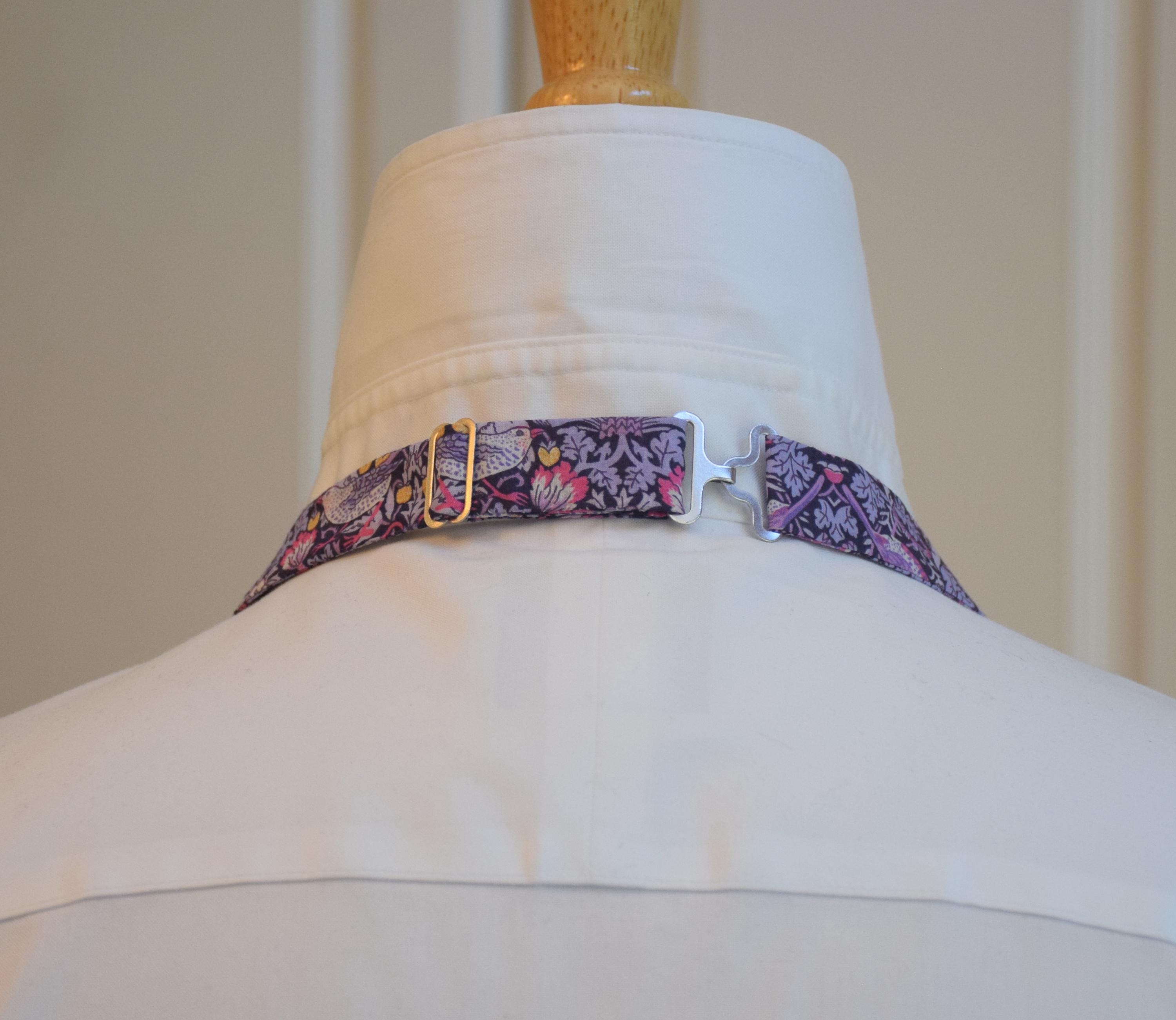 Adjustable in both pre-tied and self-tie version between 14" - 19.5". Pre-tied version has the hook and slider visible at the back (as shown in the photos) but can still be tied and un-tied. The self-tie version has a hidden internal size adjustment mechanism (T hook and sizing ribbon) and can only be tied while on the person wearing it.