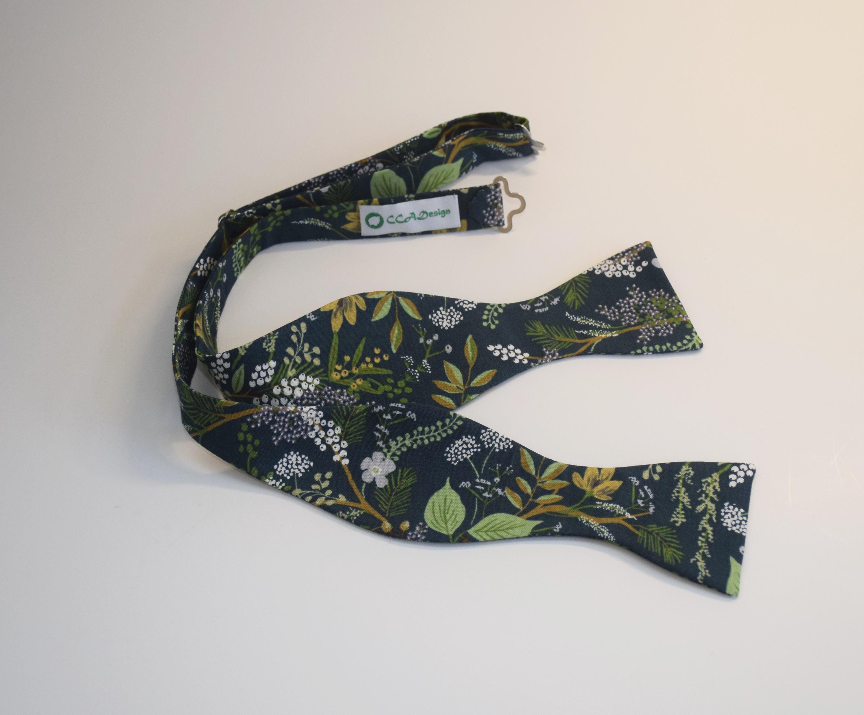 Forest leaves and flowers in green, white and brown on a dark hunter green background. PLEASE NOTE: due to the scale and nature of the design, precise motif and color placement will vary from tie to tie - and also on how you tie the bow tie.