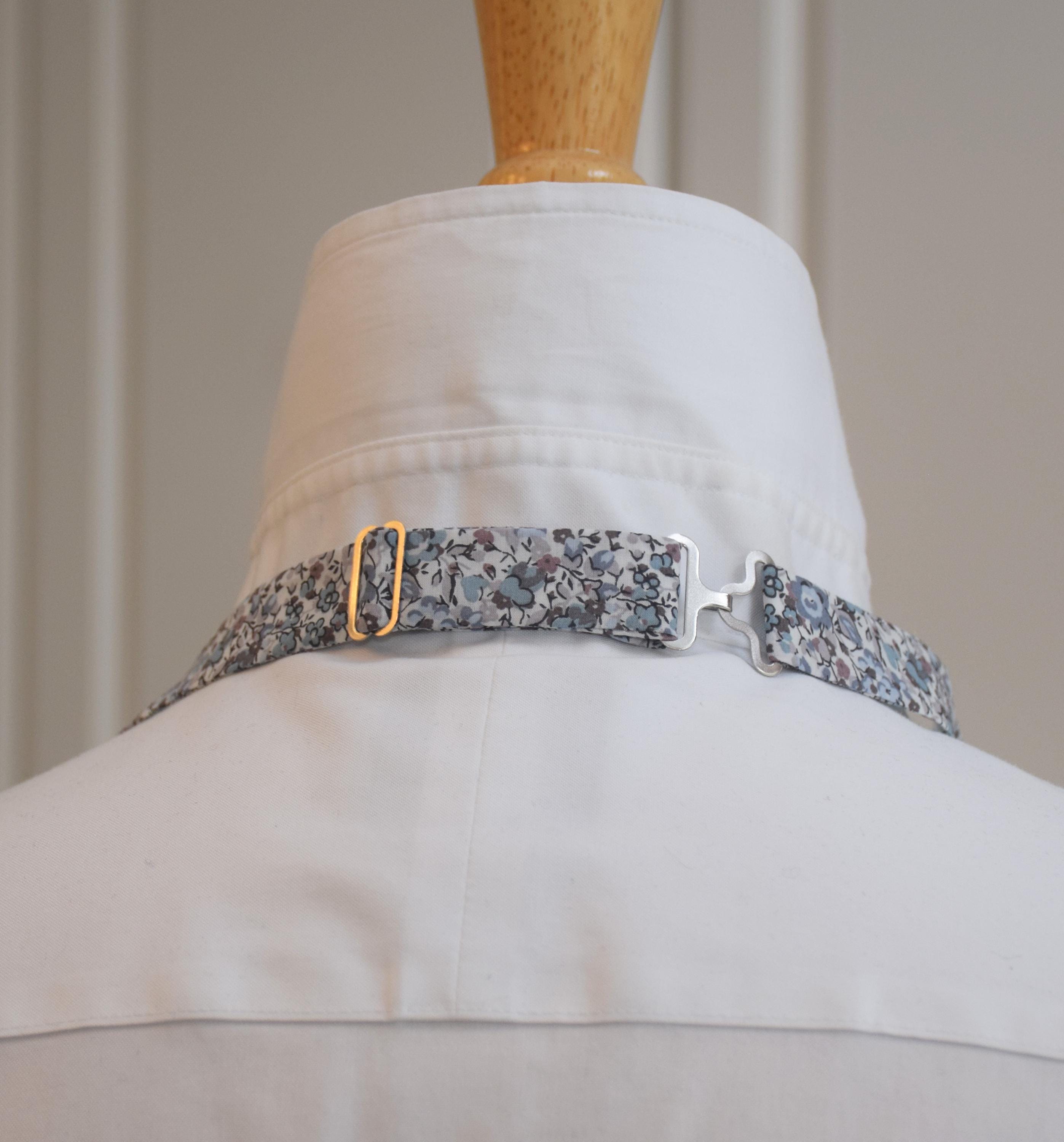Adjustable in both pre-tied and self-tie version between 14" - 19.5". Pre-tied version has the hook and slider visible at the back (as shown in the photos) but can still be tied and un-tied. The self-tie version has a hidden internal size adjustment mechanism (T hook and sizing ribbon) and can only be tied while on the person wearing it.