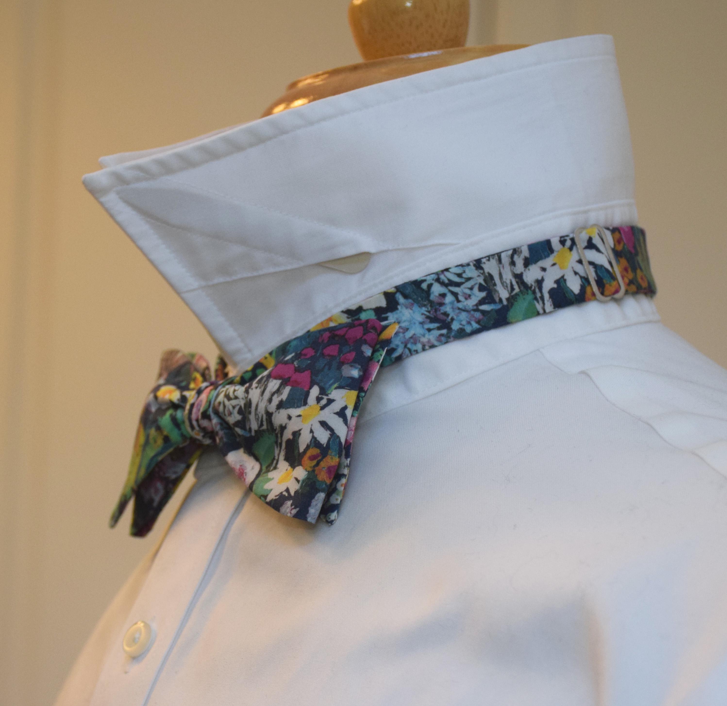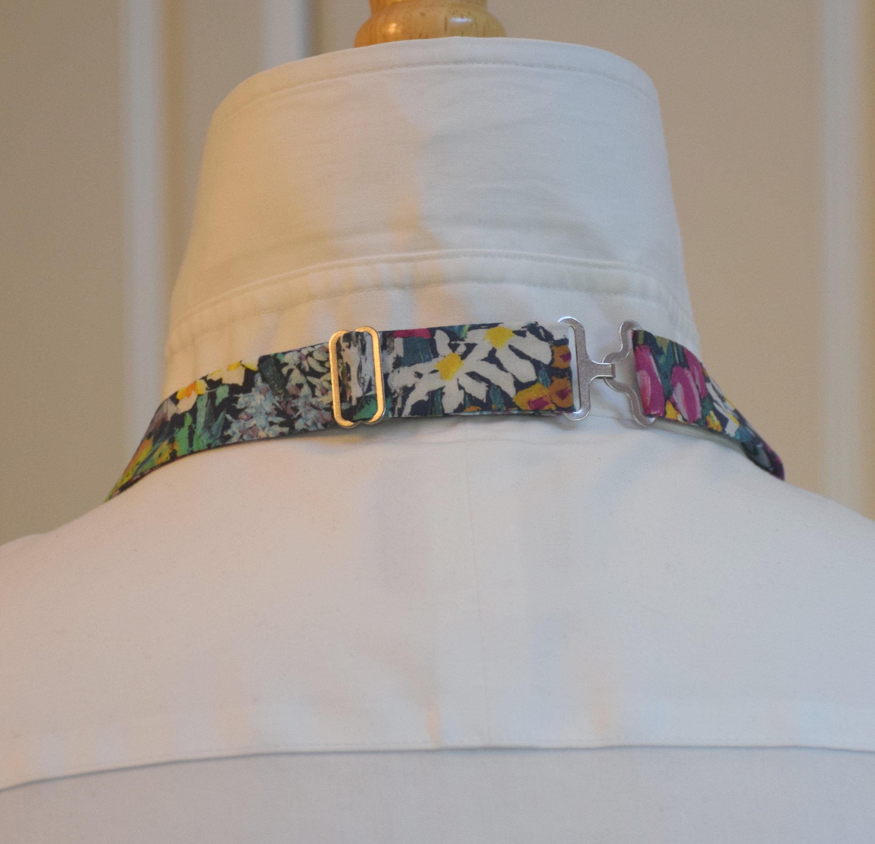 Adjustable in both pre-tied and self-tie version between 14" - 19.5". Pre-tied version has the hook and slider visible at the back (as shown in the photos) but can still be tied and un-tied. The self-tie version has a hidden internal size adjustment mechanism (T hook and sizing ribbon) and can only be tied while on the person wearing it.