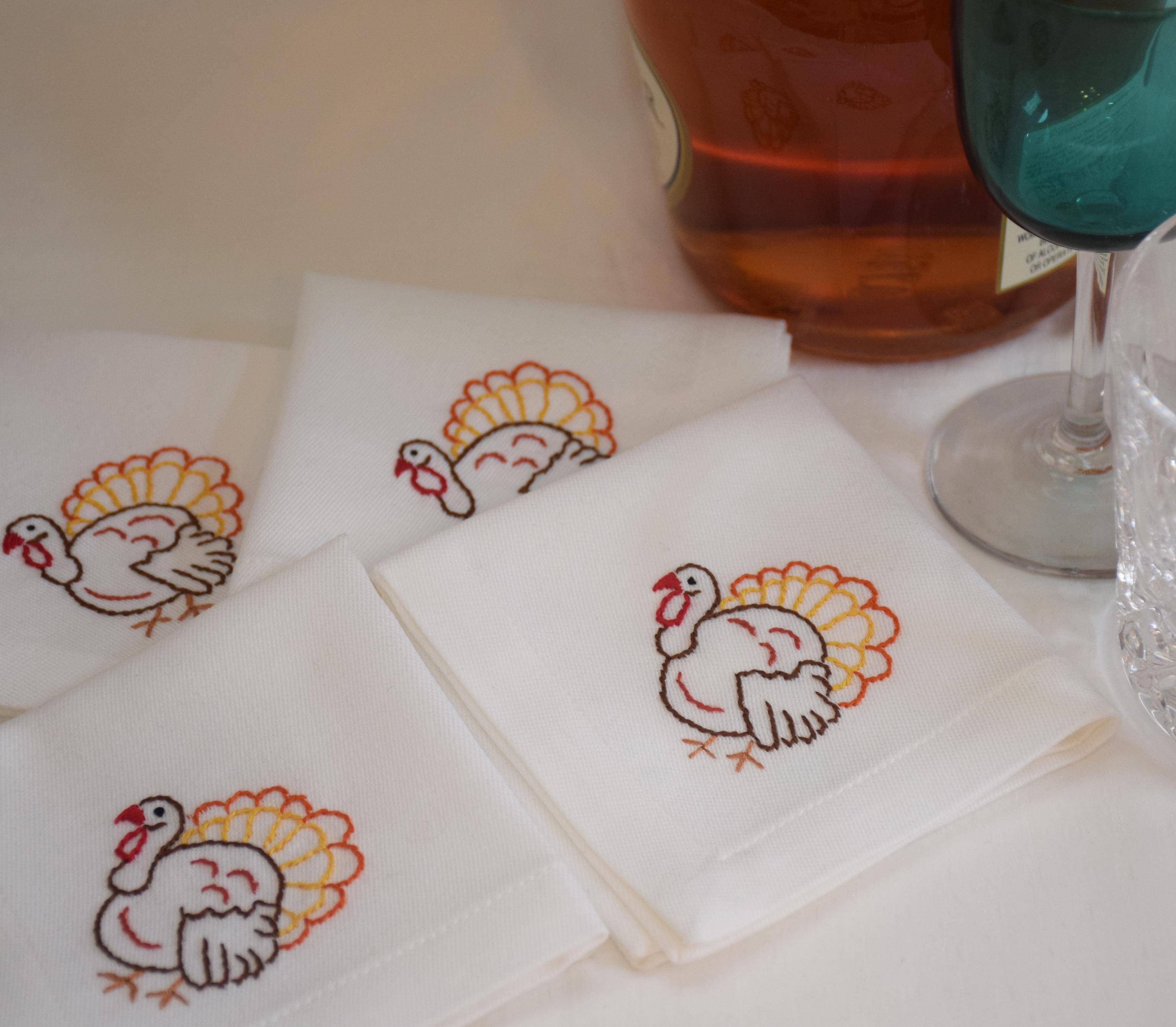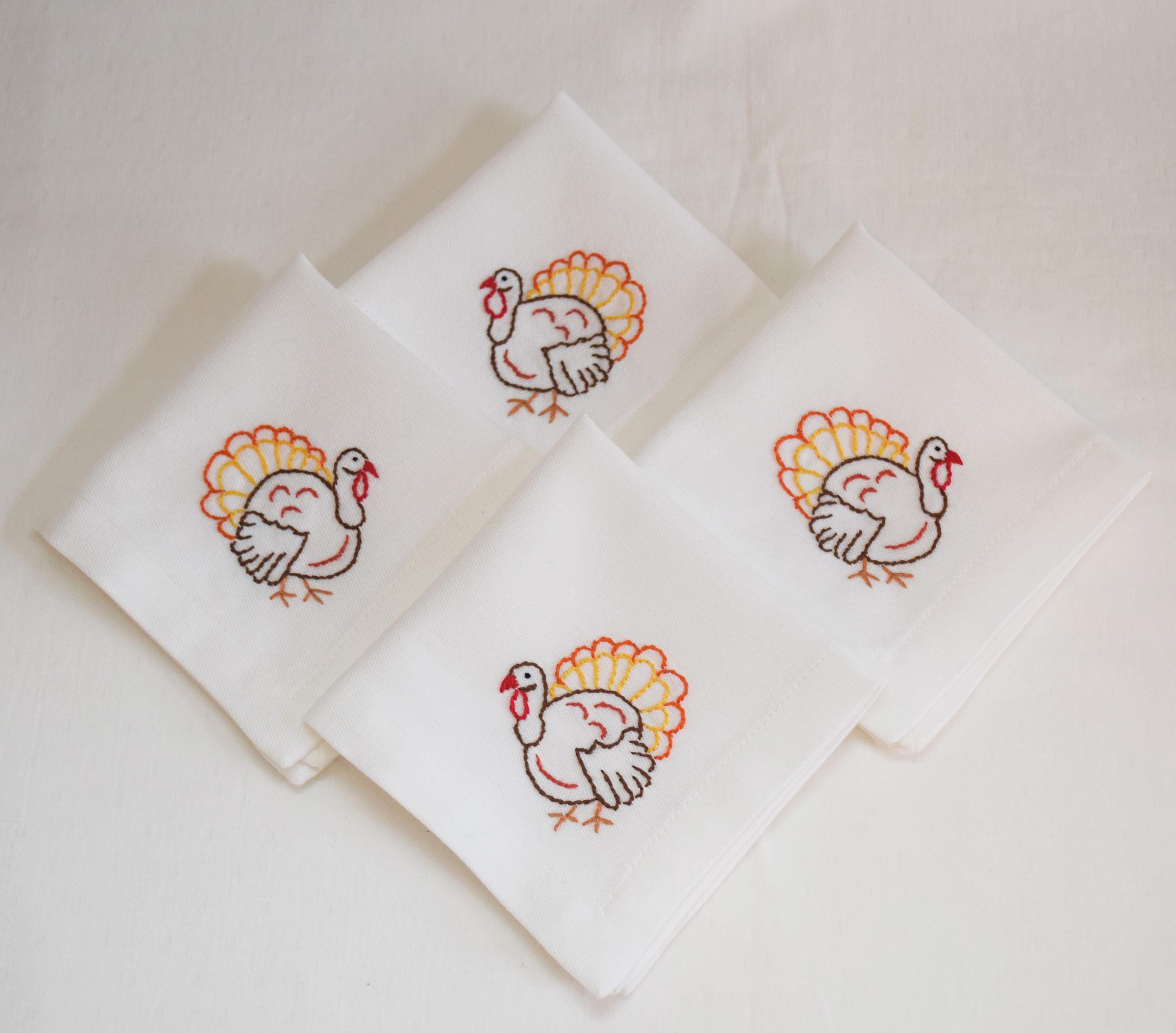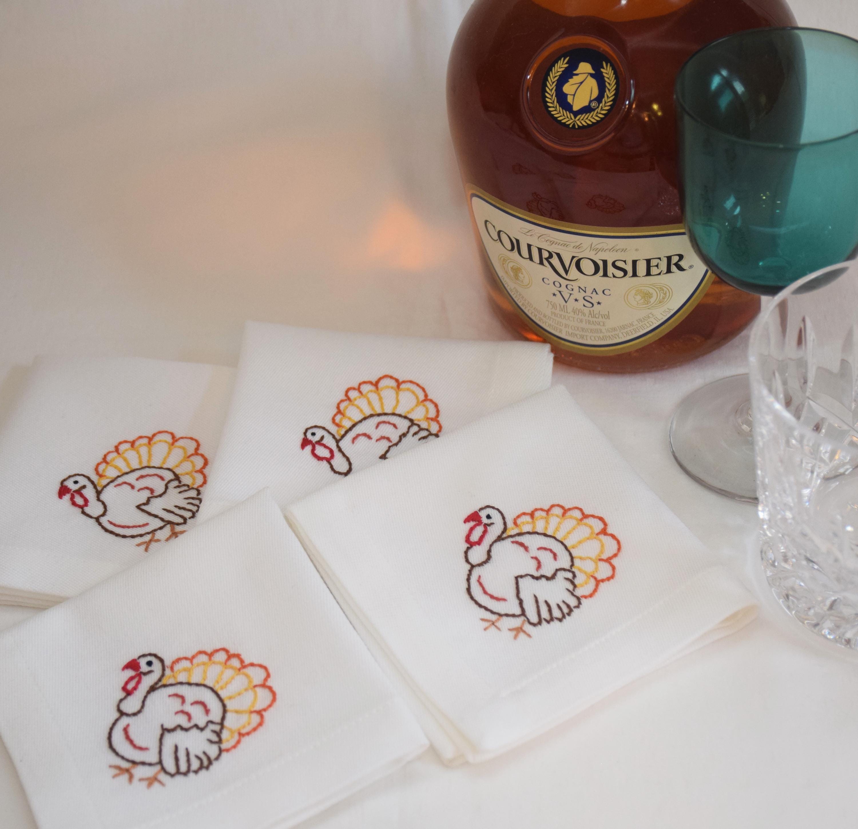 Custom made hand embroidered cocktail napkin set for Thanksgiving celebrations. This pure white cotton cocktail napkin set comprises 4 cocktail napkins, each adorned in the corner with a proud Thanksgiving turkey.