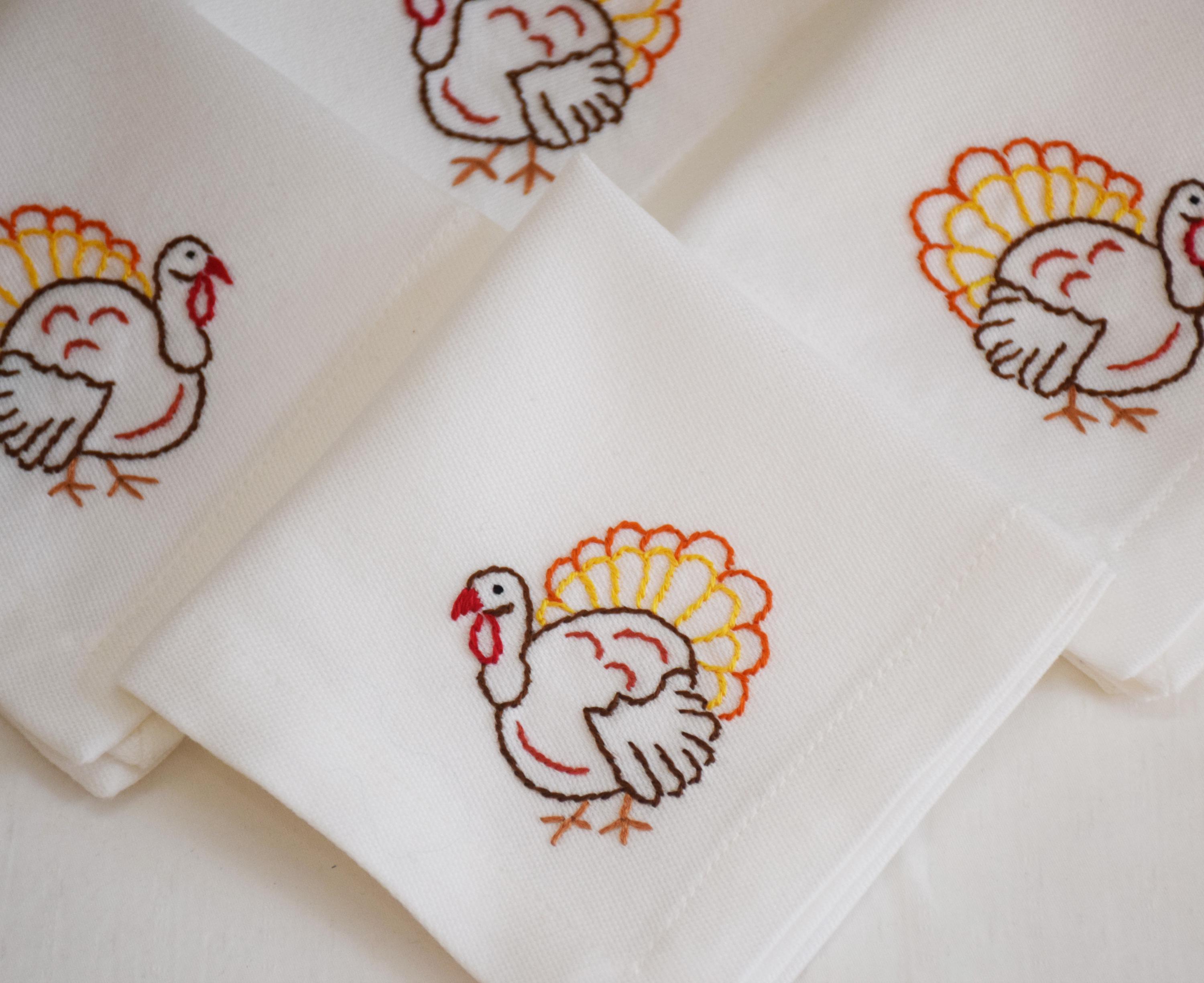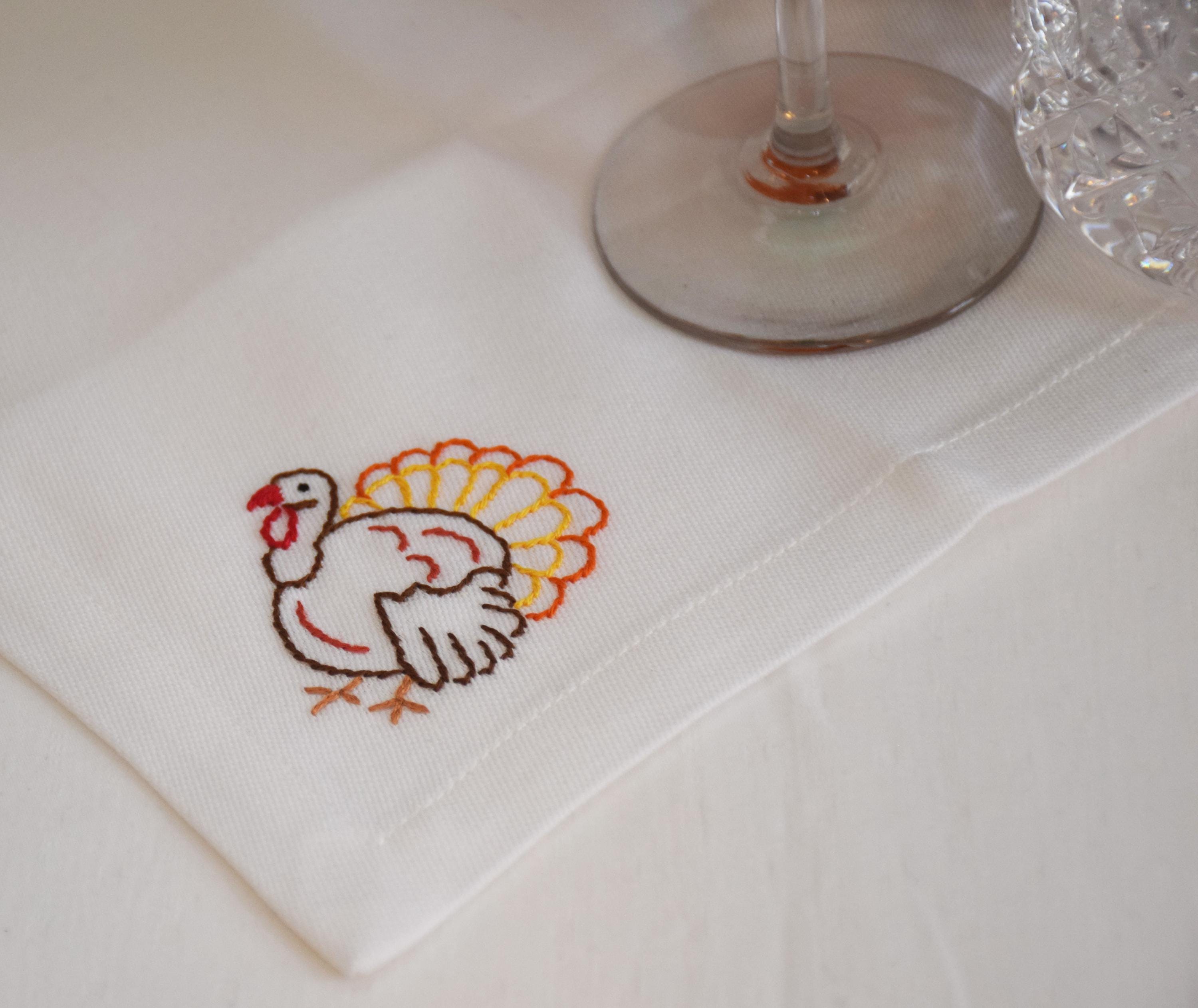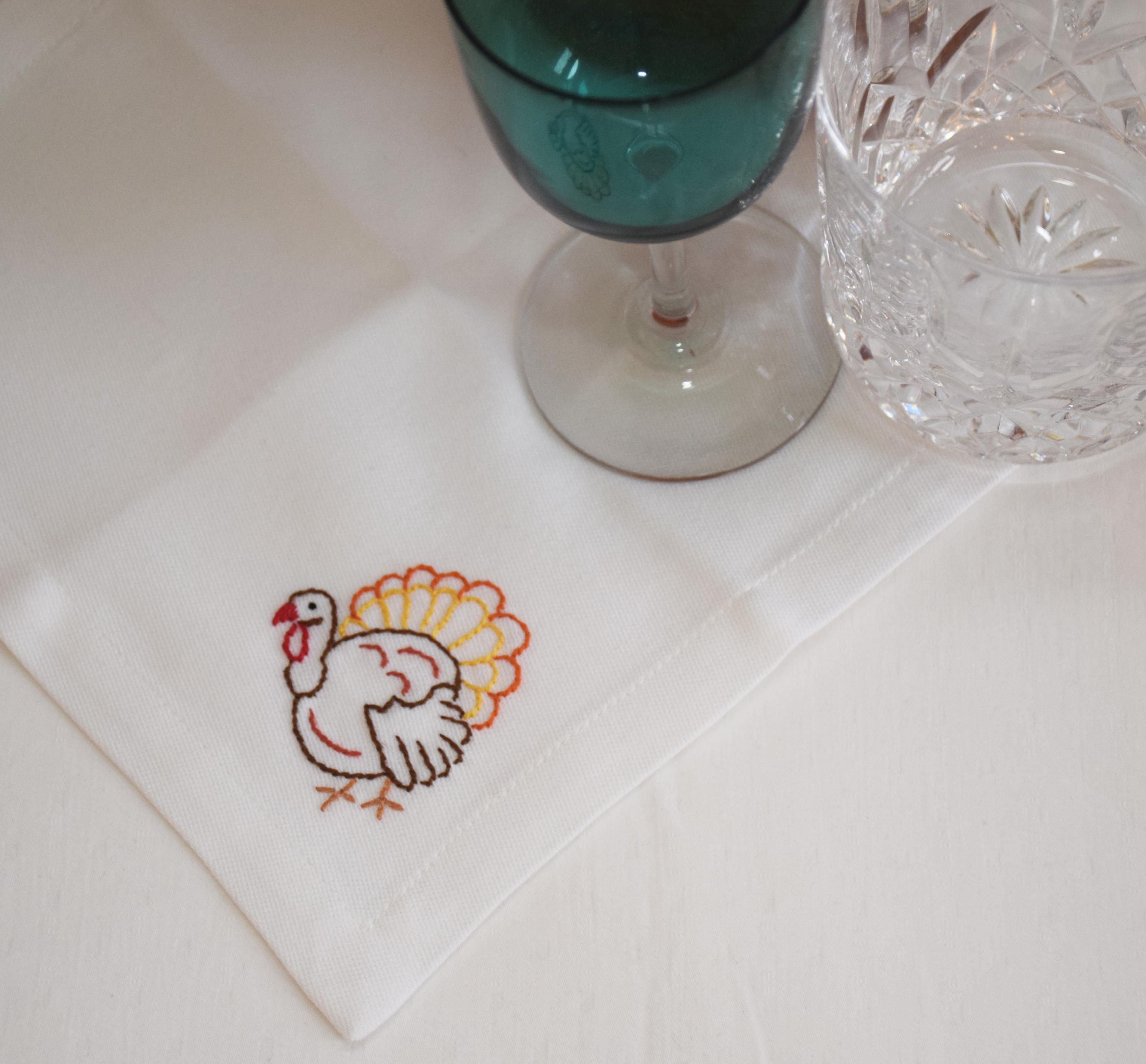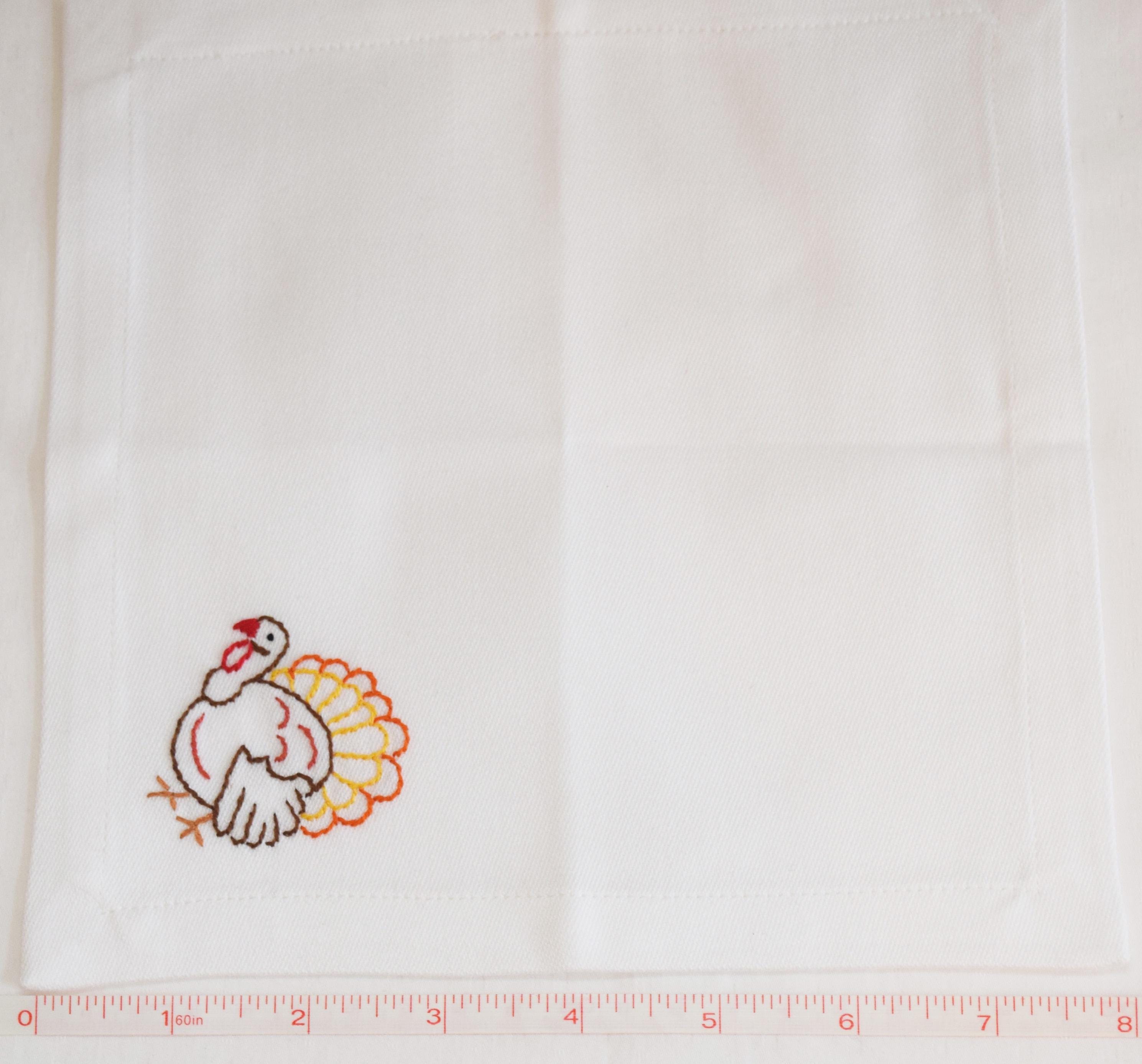 Custom made hand embroidered cocktail napkin set for Thanksgiving celebrations. This pure white cotton cocktail napkin set comprises 4 cocktail napkins, each adorned in the corner with a proud Thanksgiving turkey.