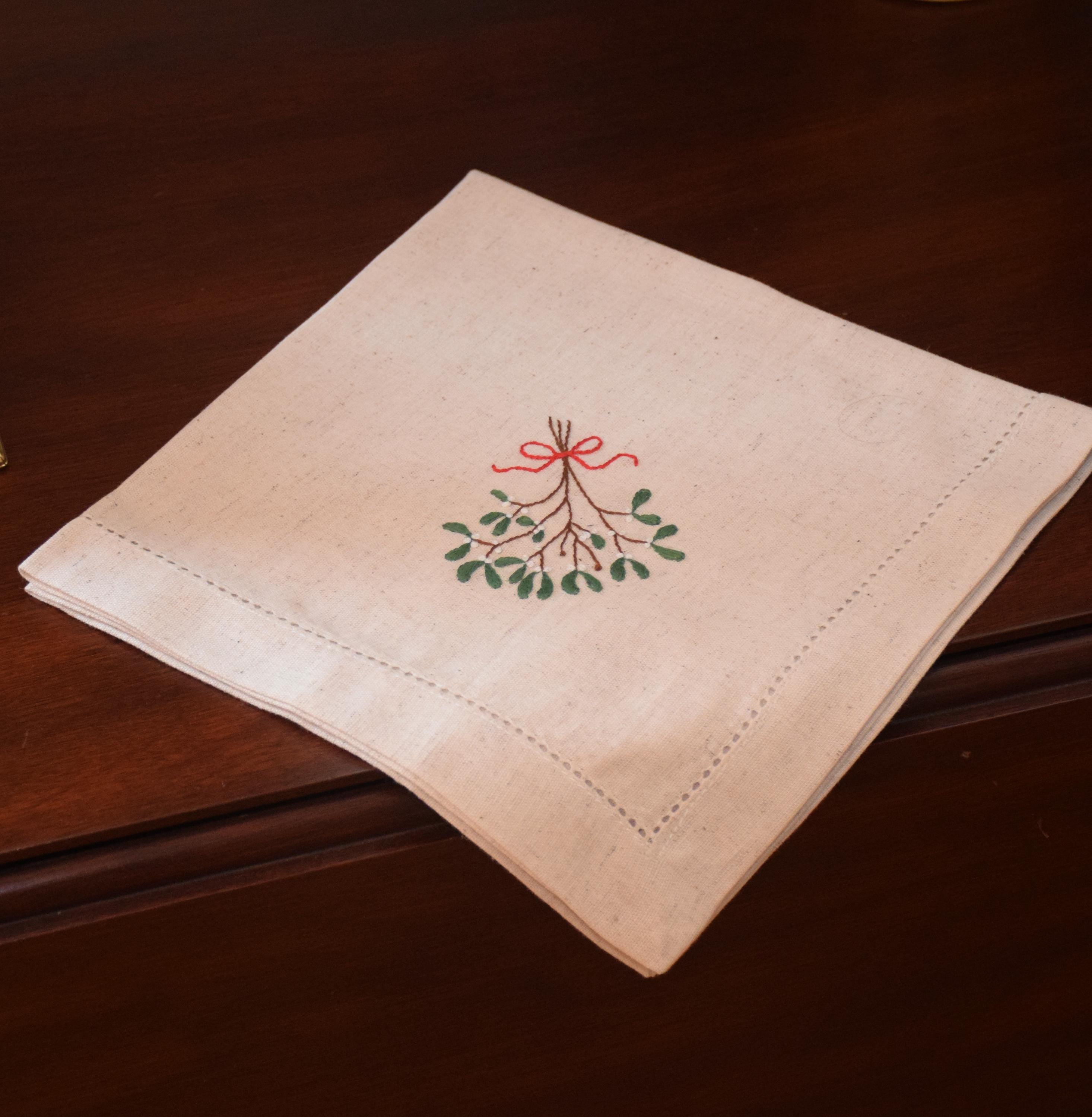 SHIP READY!! Need a last minute gift? This set of 6 custom-made hand embroidered mistletoe design dinner napkins is ready to go on a moment's notice!! Natural linen/cotton blend napkins with hem stitched edges are adorned in the corner with a sprig of mistletoe bound with a cheery red ribbon.