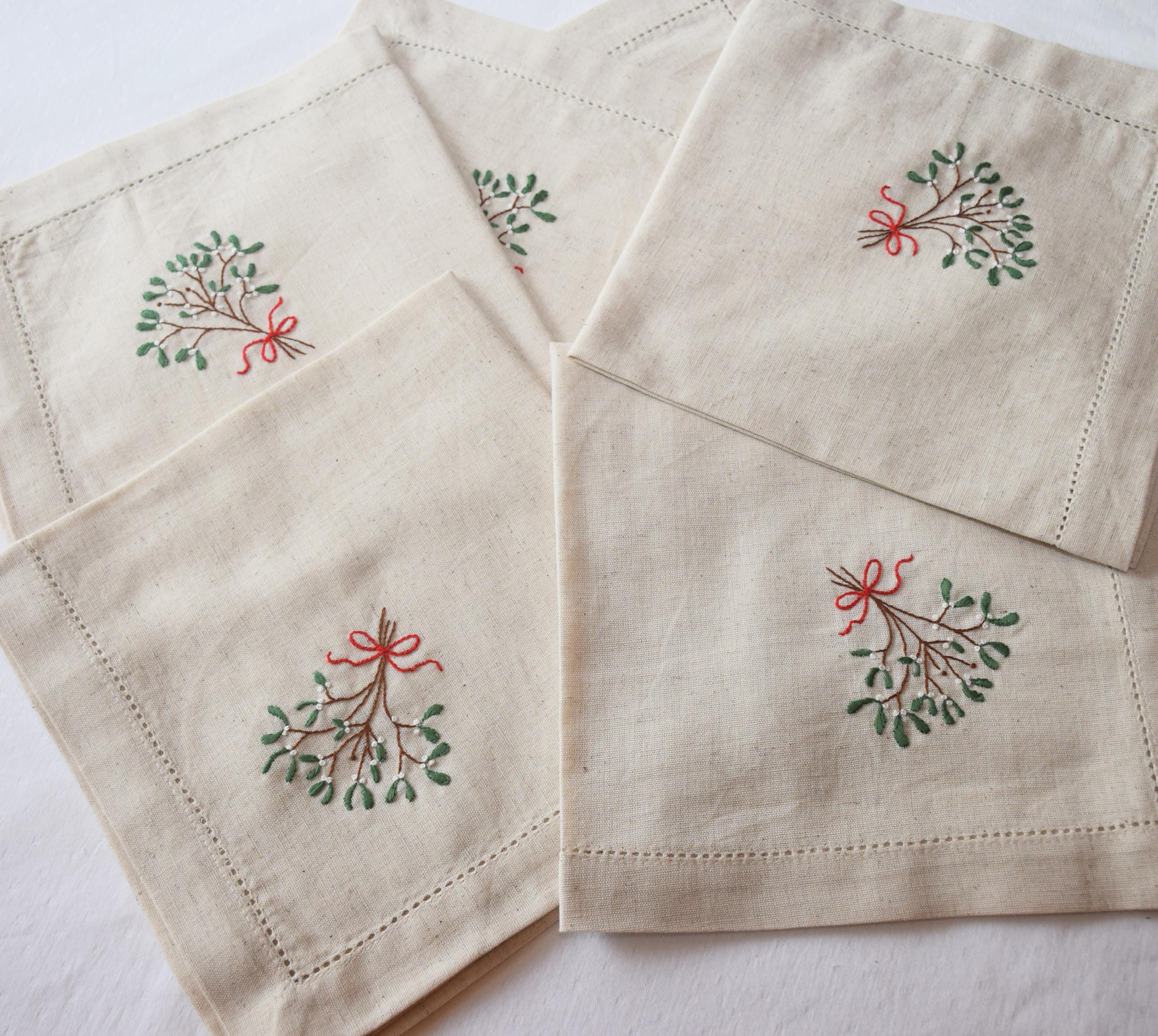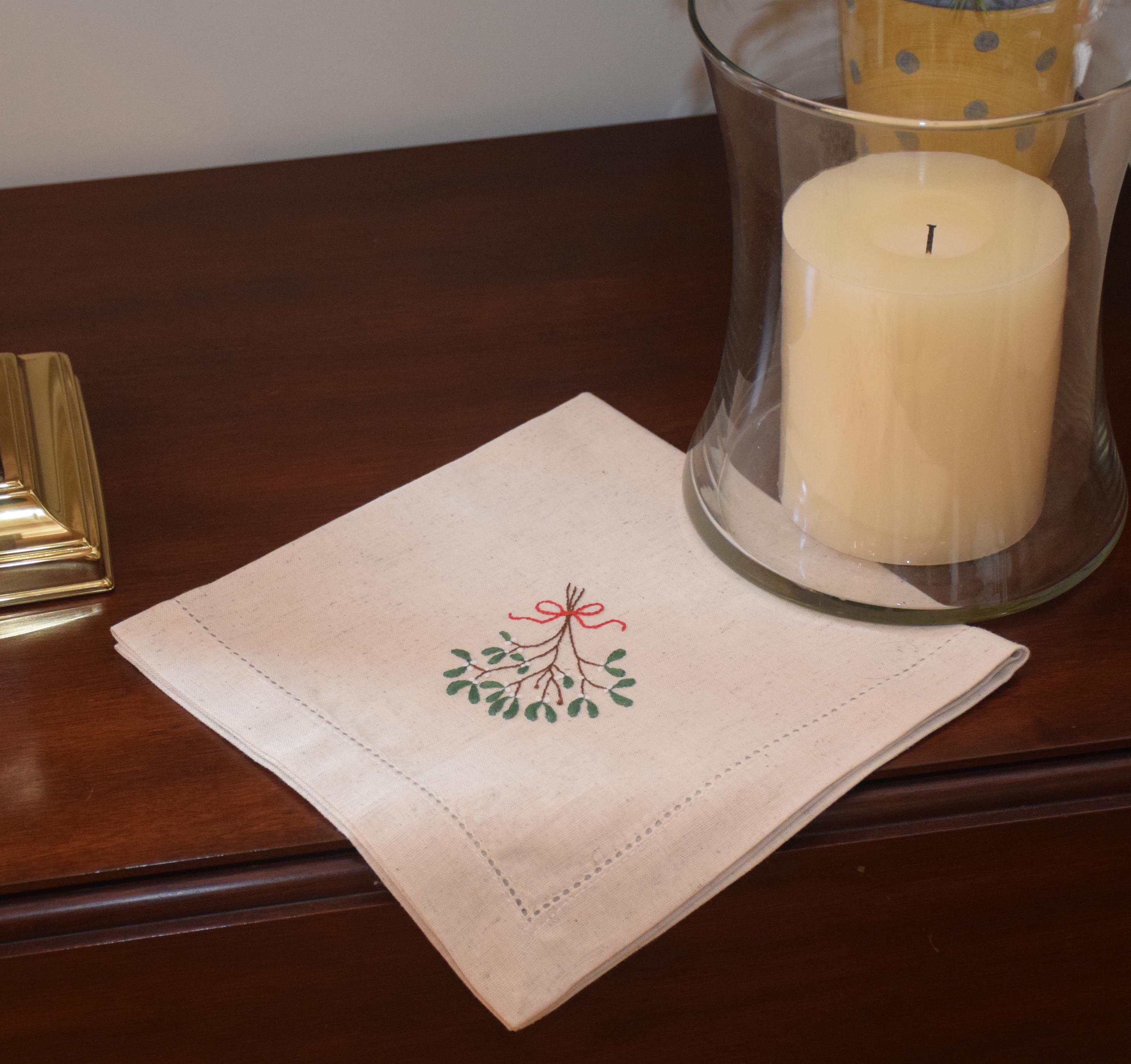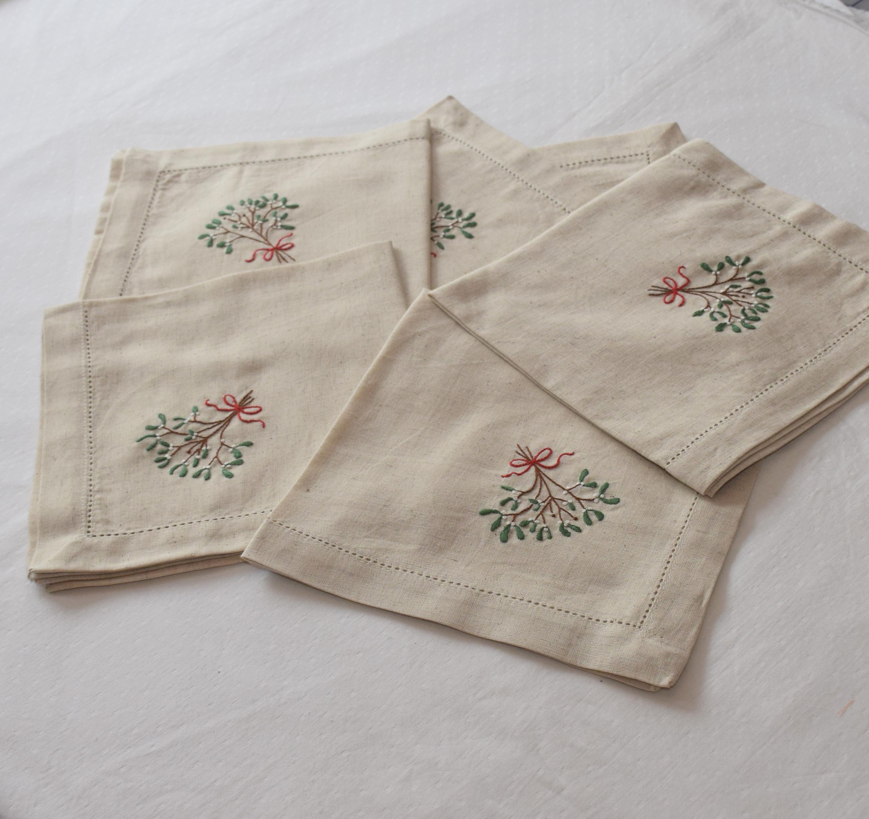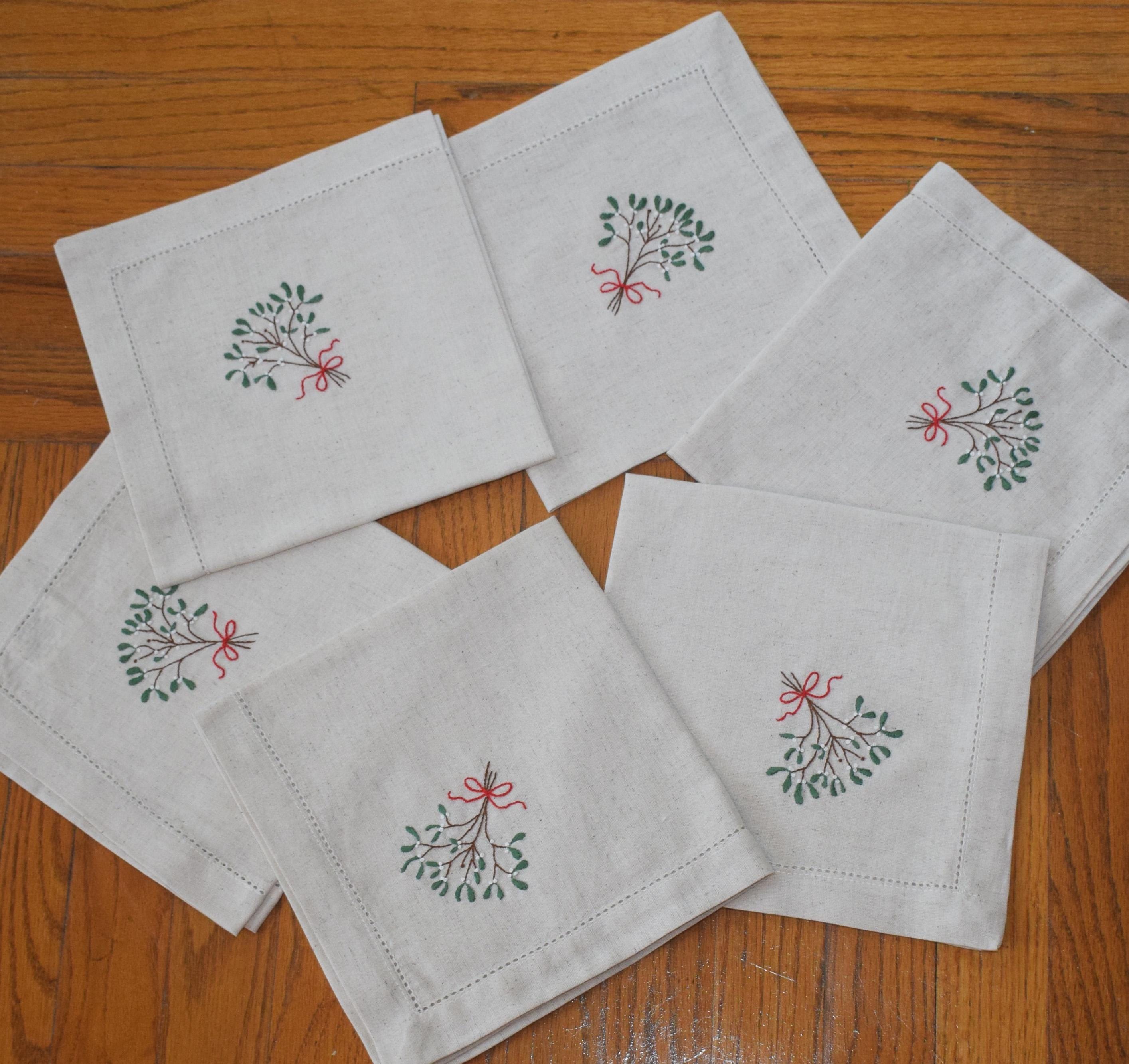 Hand embroidered Mistletoe 6 dinner napkin set, 18" natural cotton/linen, holiday