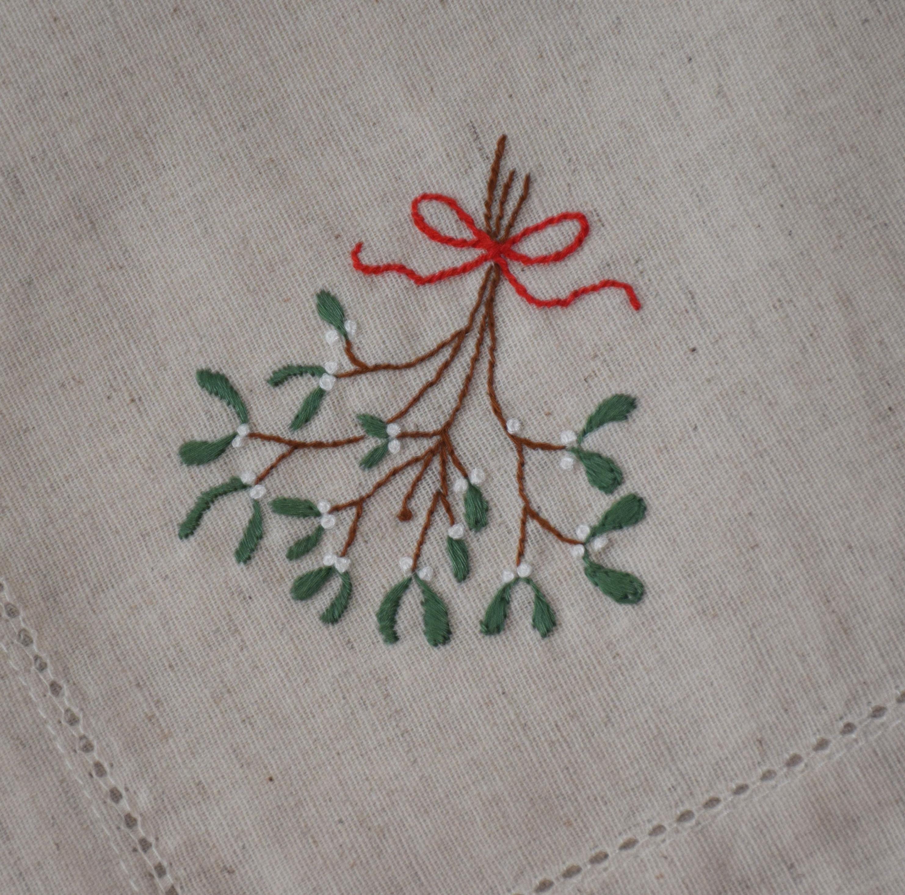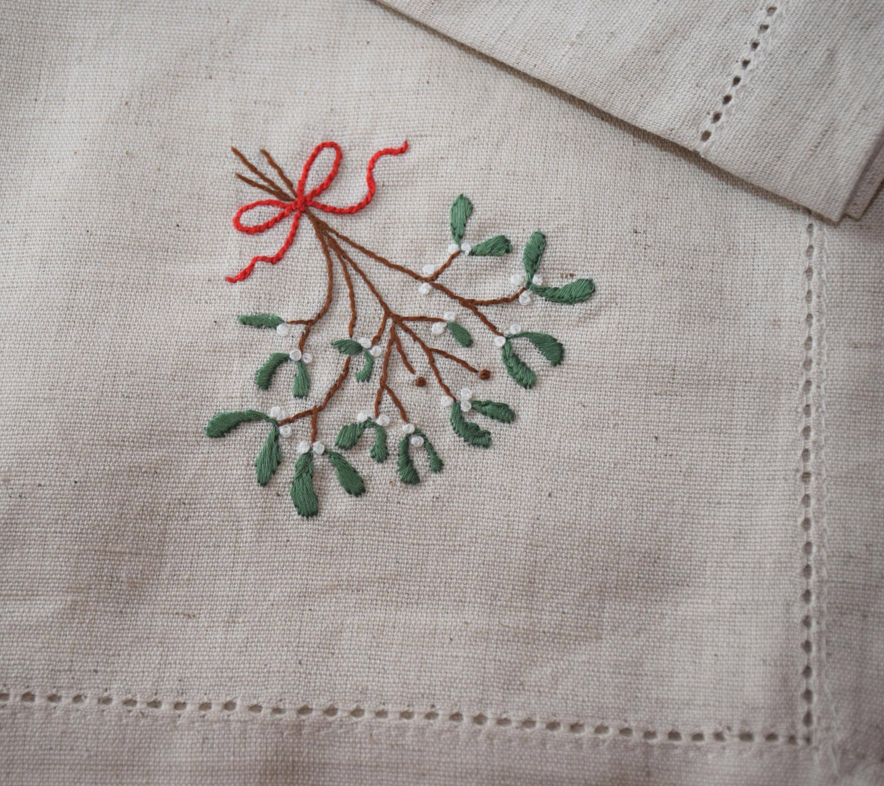 Hand embroidered Mistletoe dinner napkin set, 18" natural cotton/linen, holiday