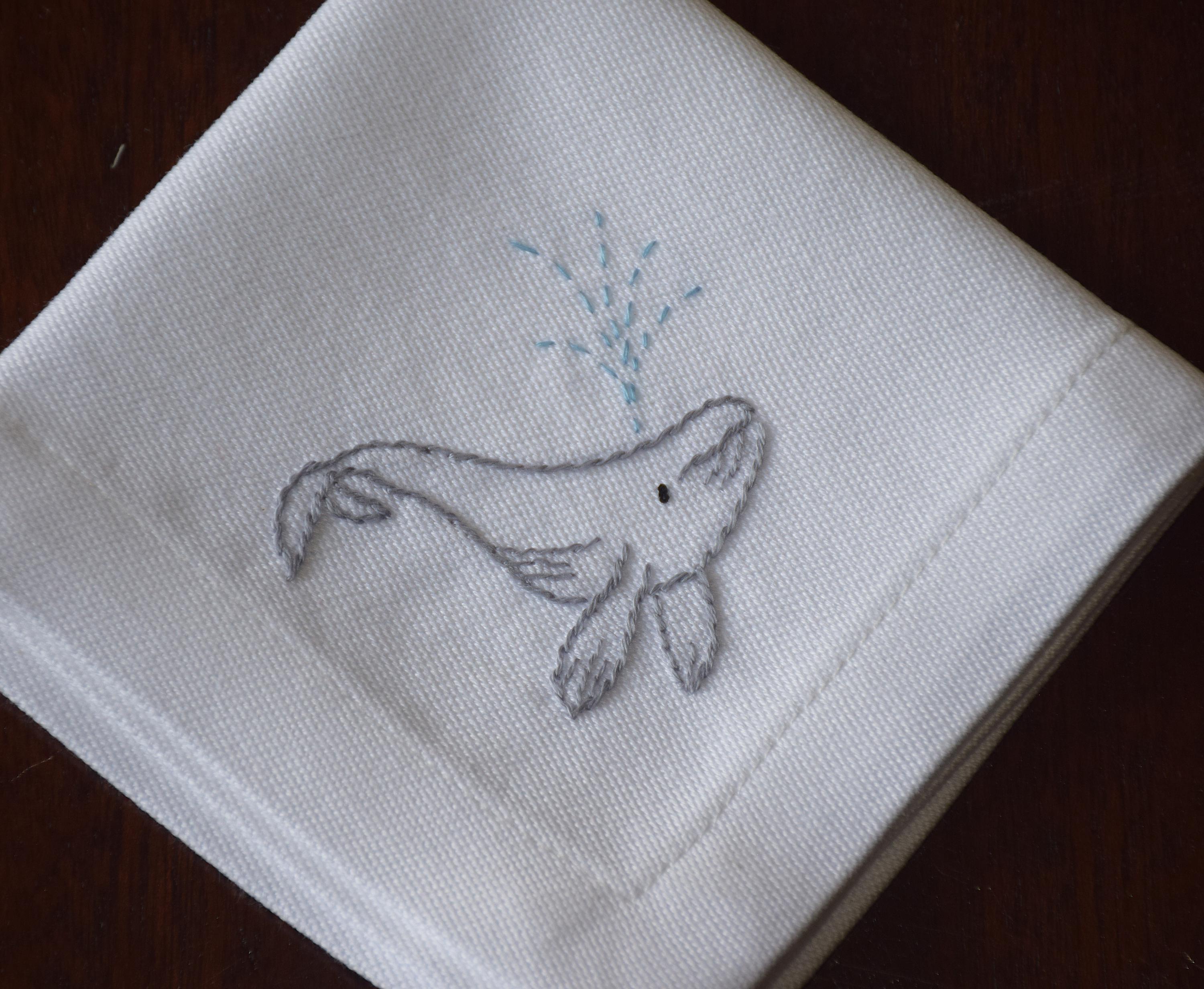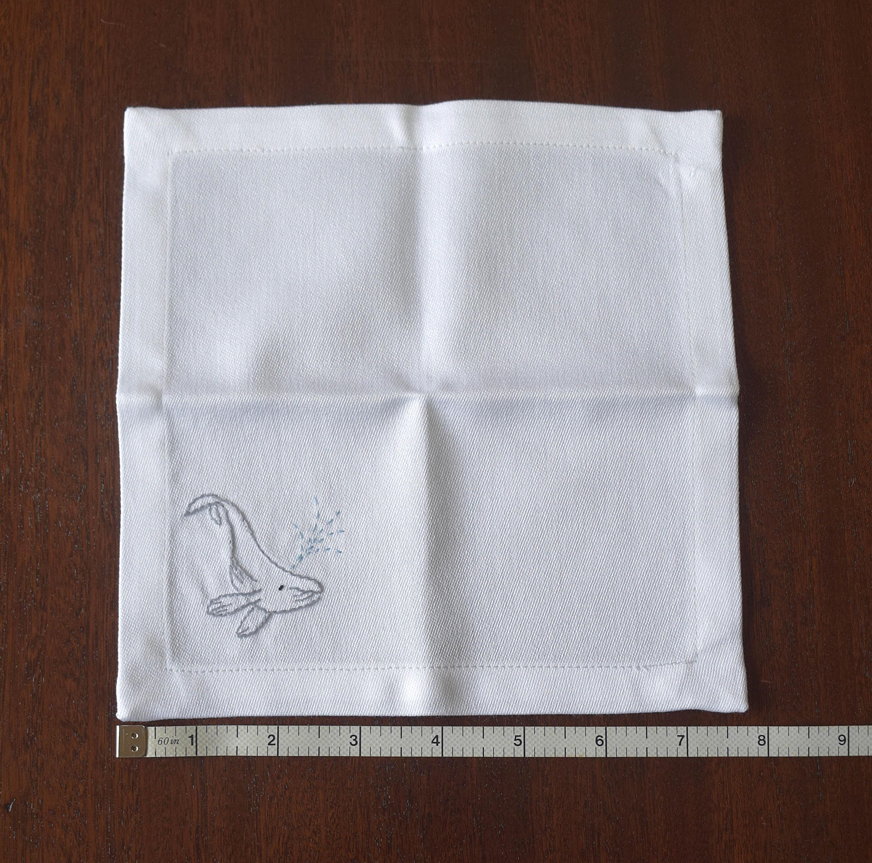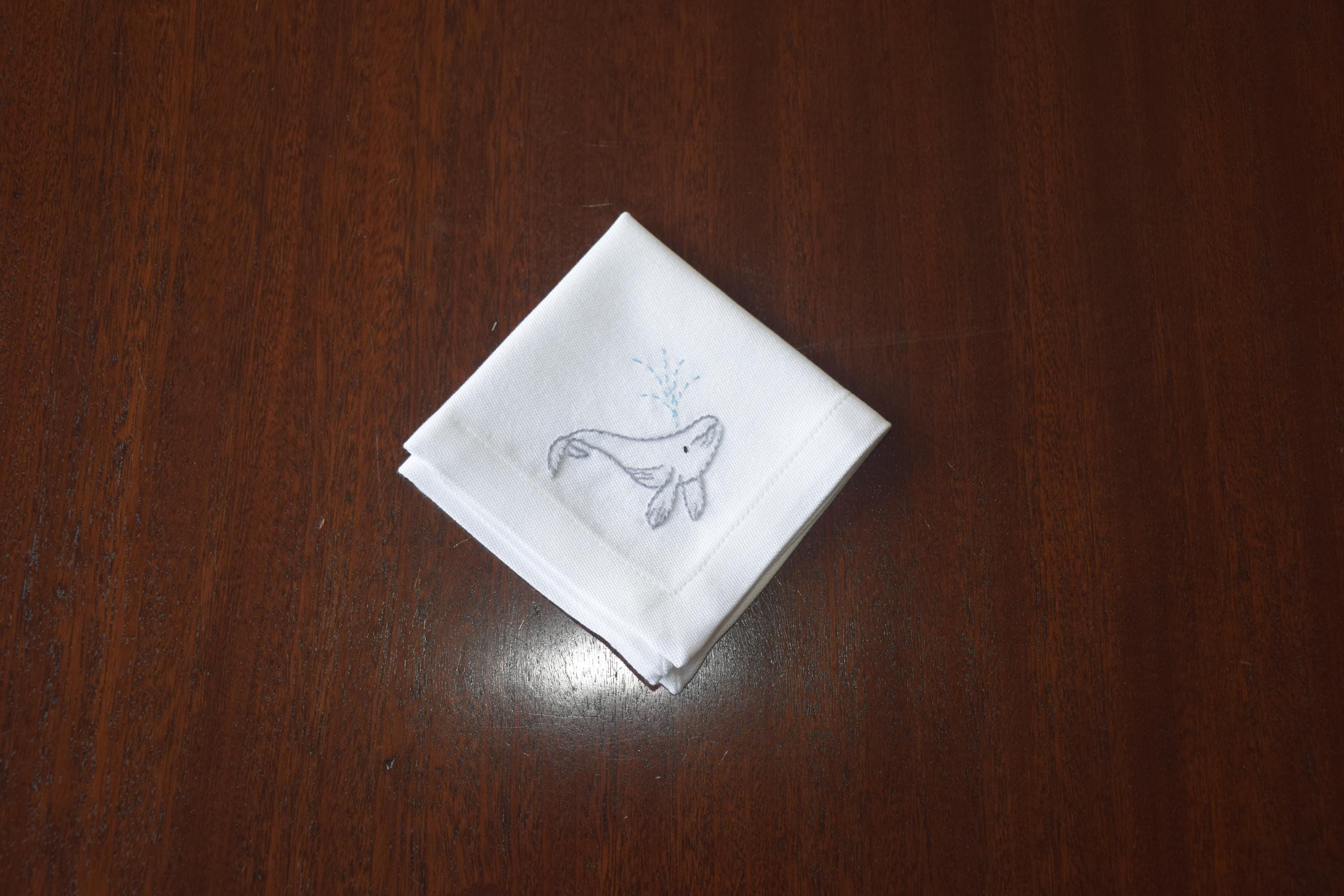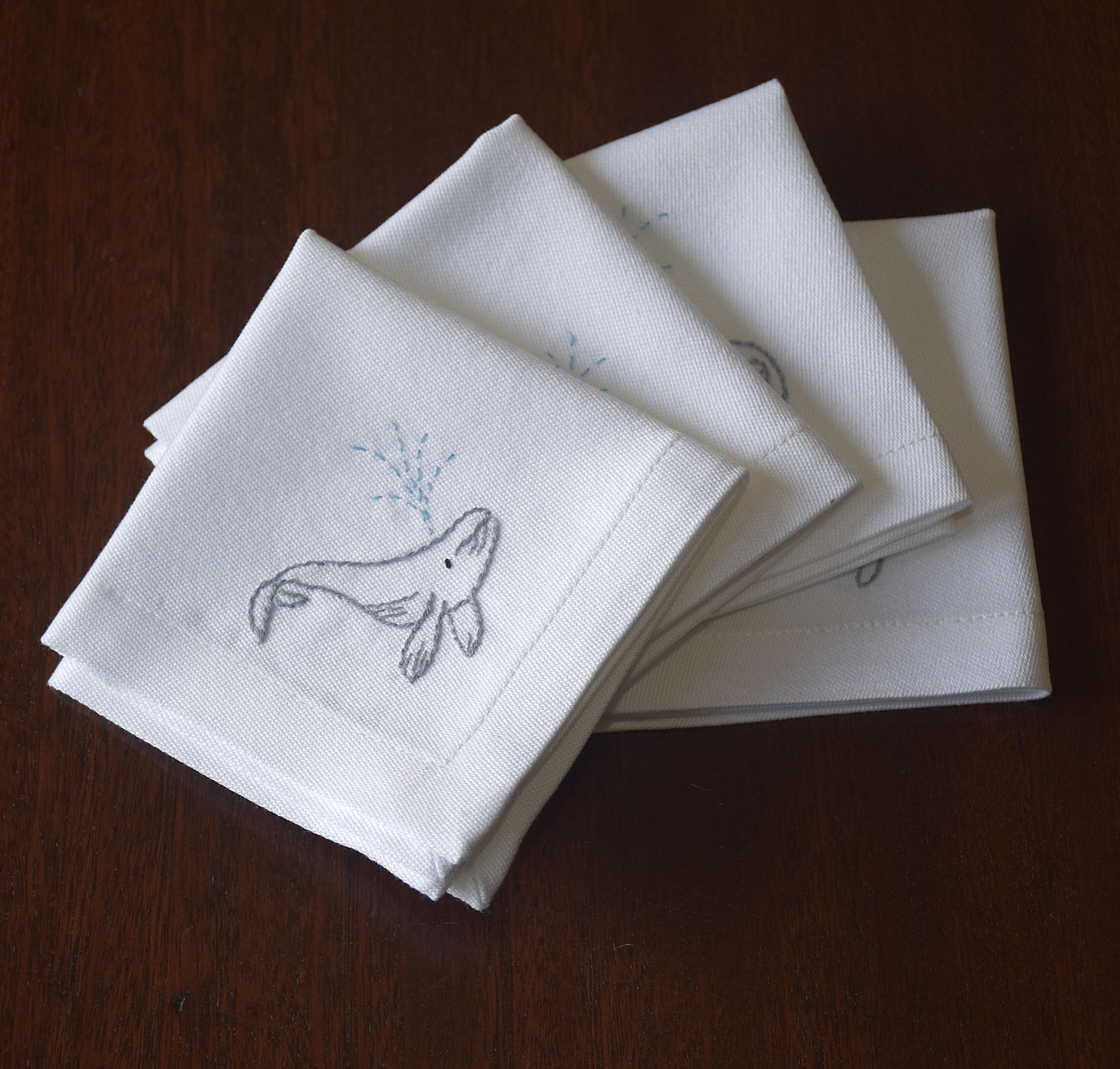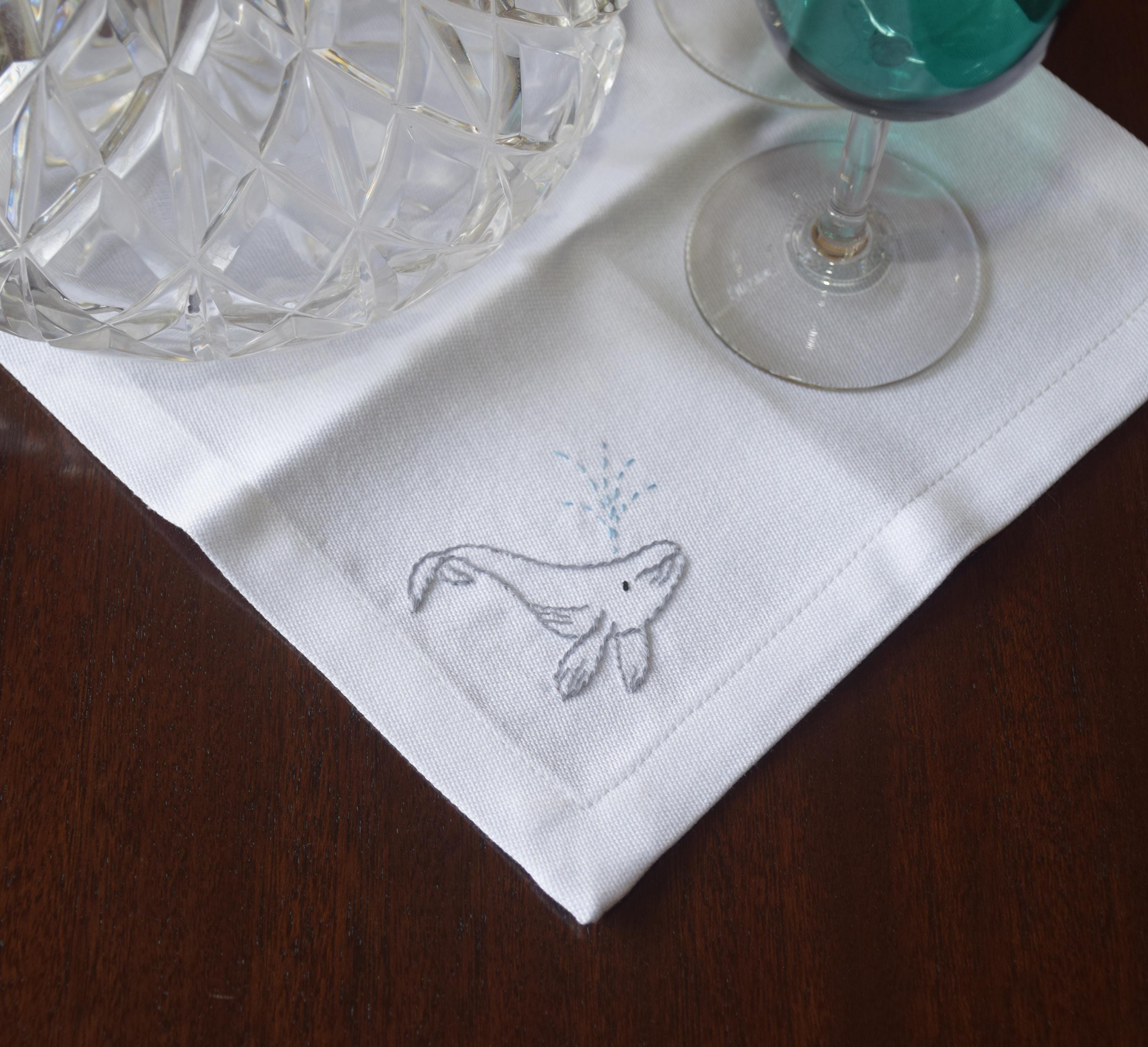 Pure white cotton cocktail napkins are each adorned in one corner with a hand embroidered spouting humpback whale.