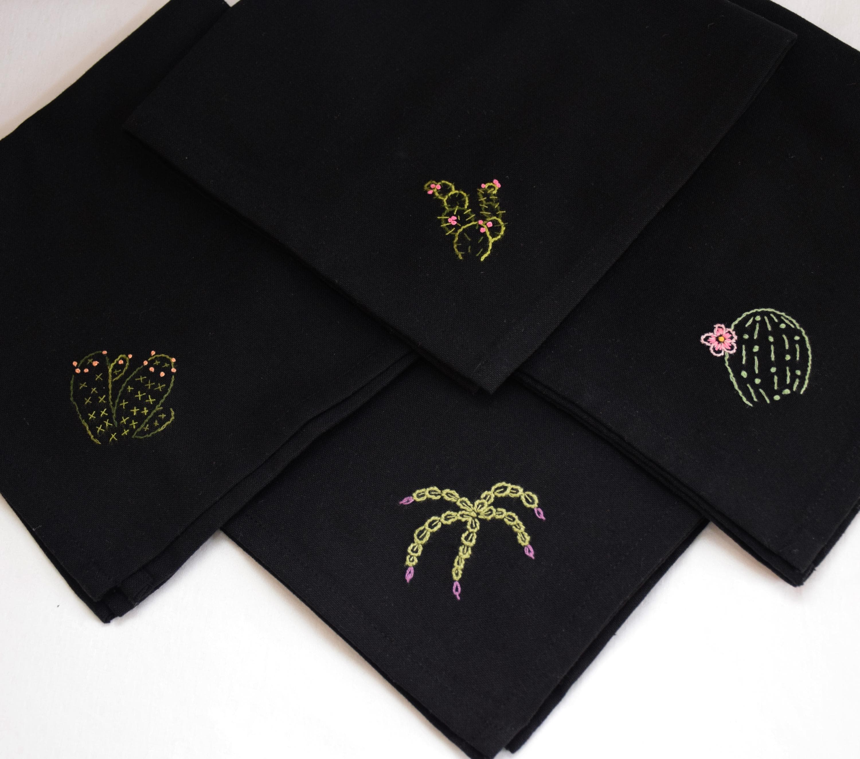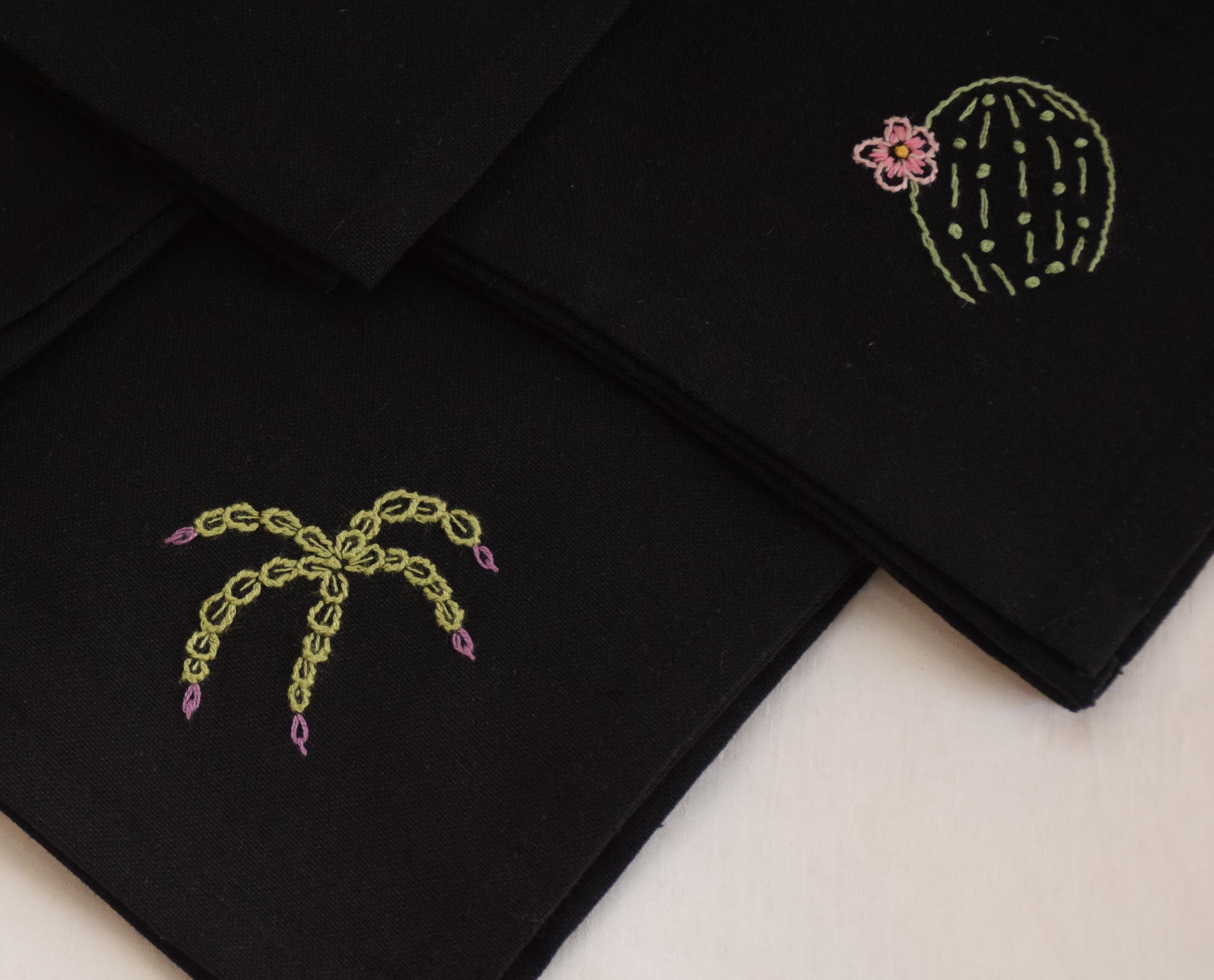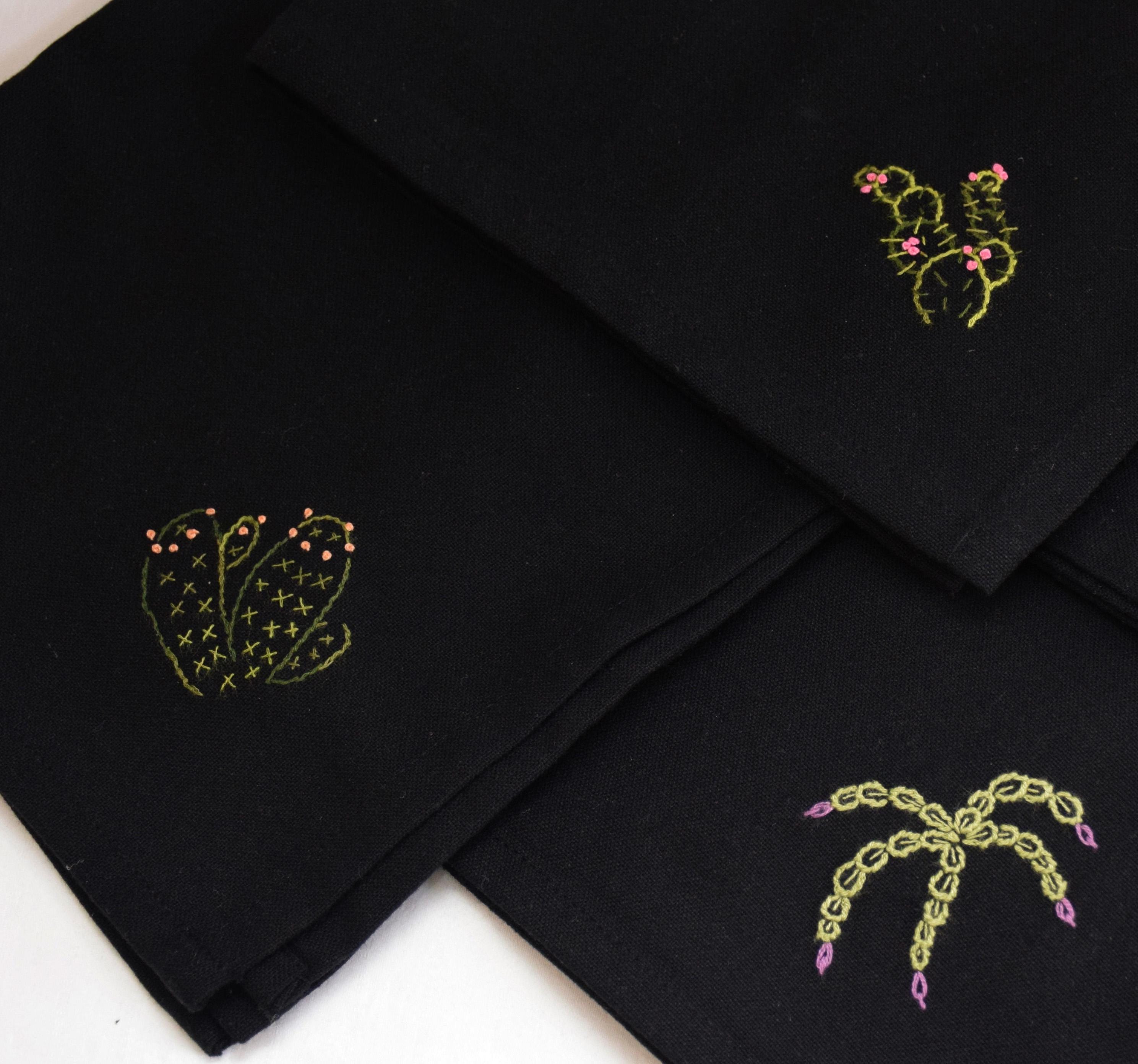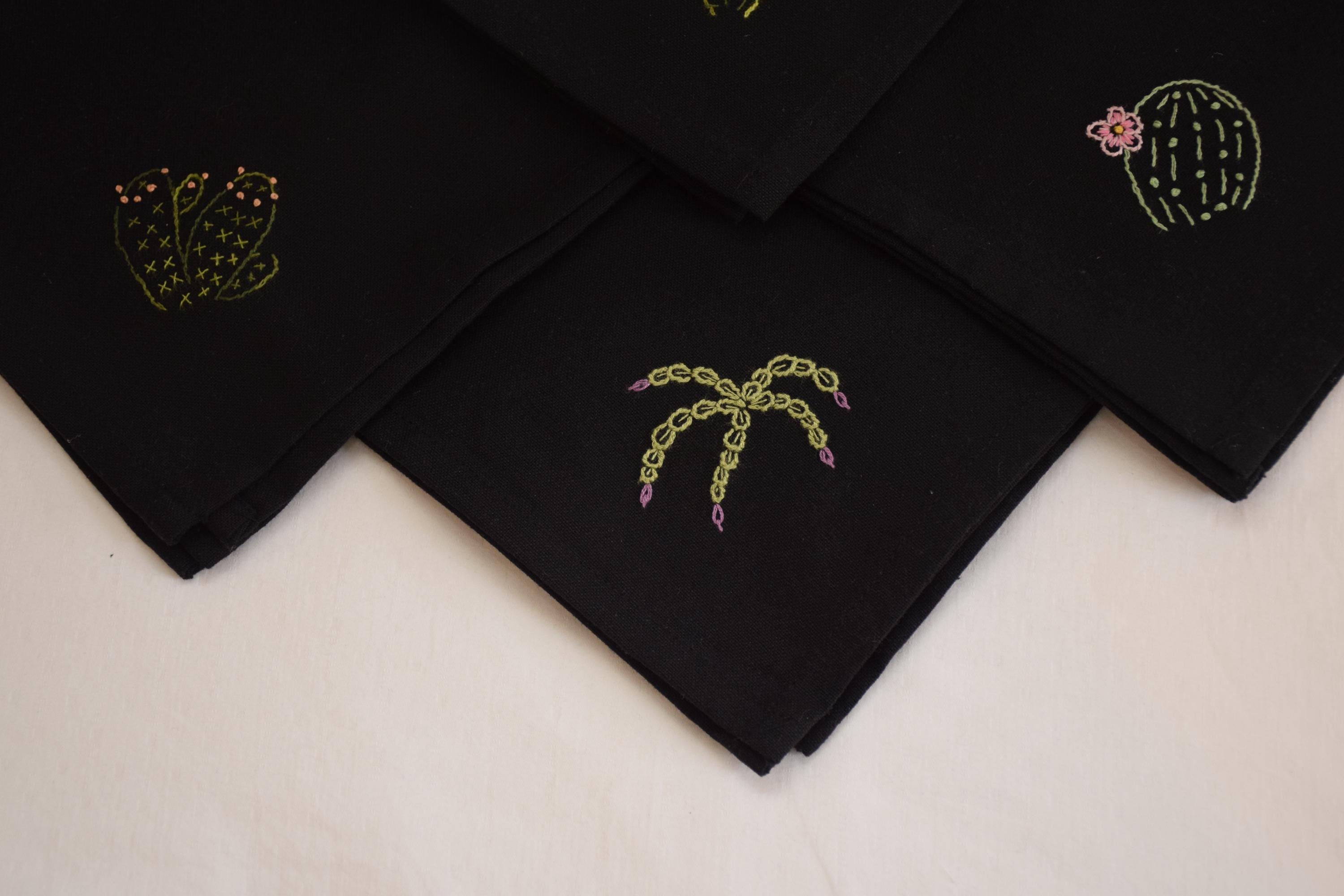Set of 4 hand embroidered southwestern theme dinner napkins - rich black 18" square cotton napkins are adorned in two corners with different cacti.