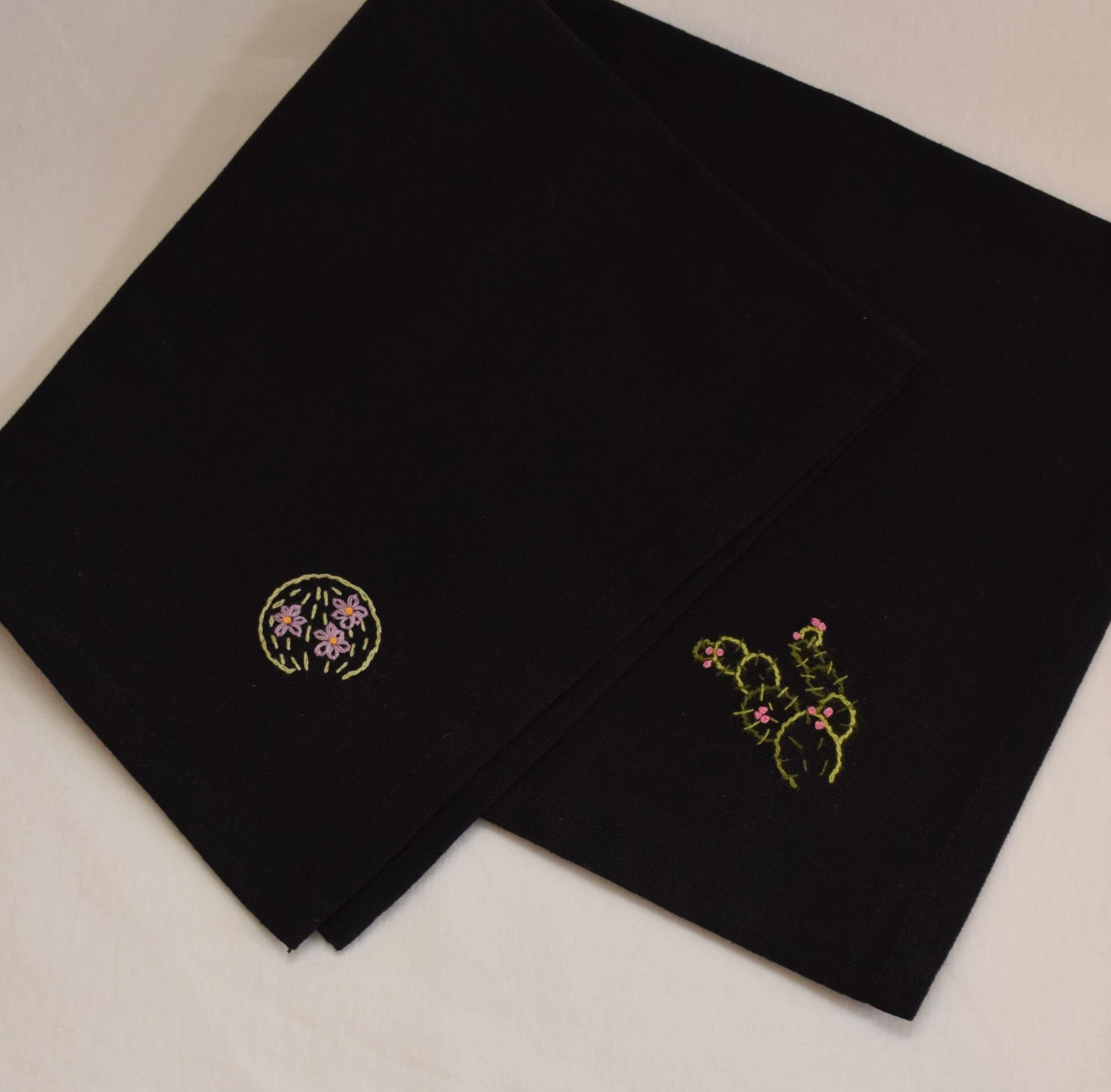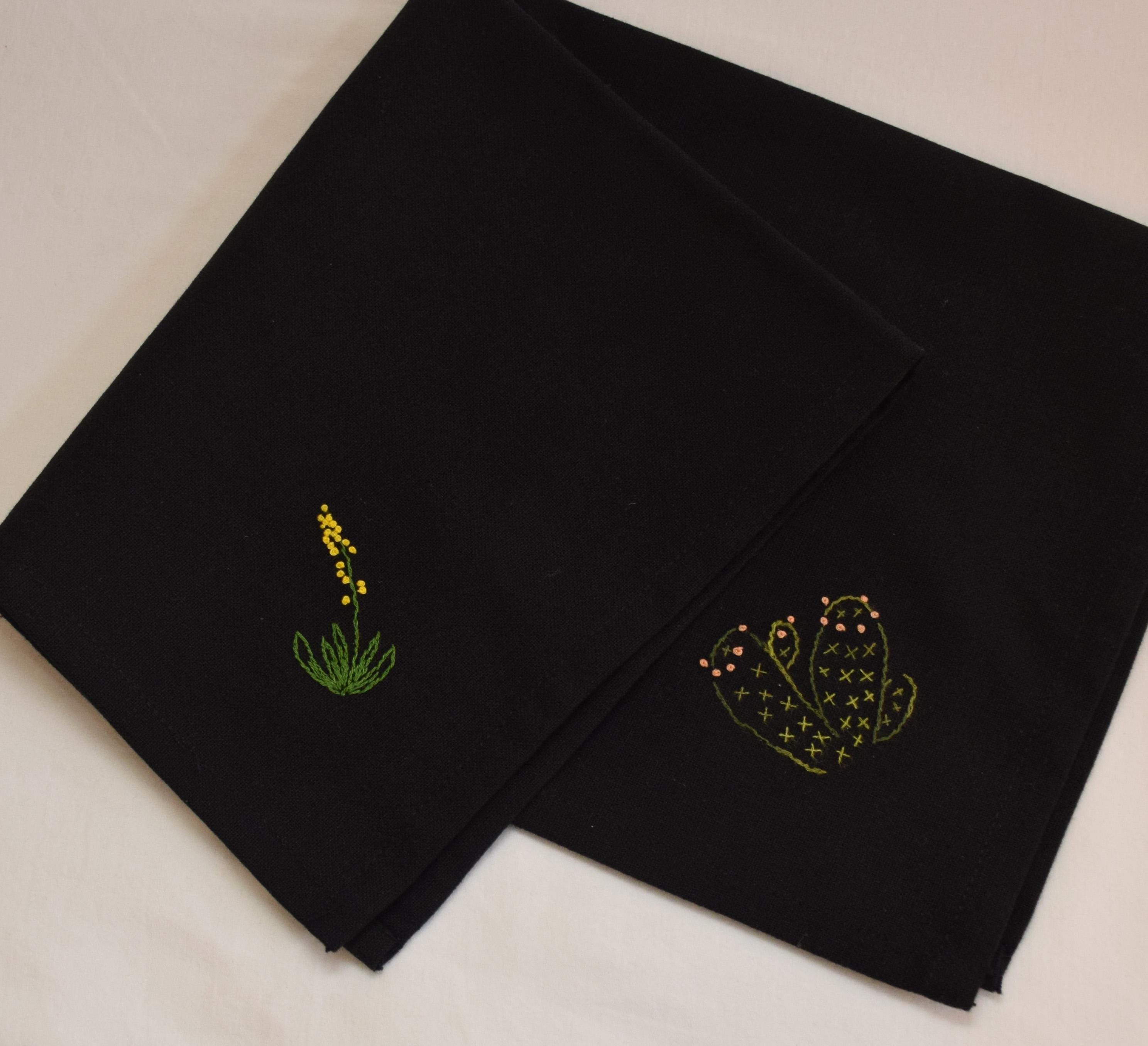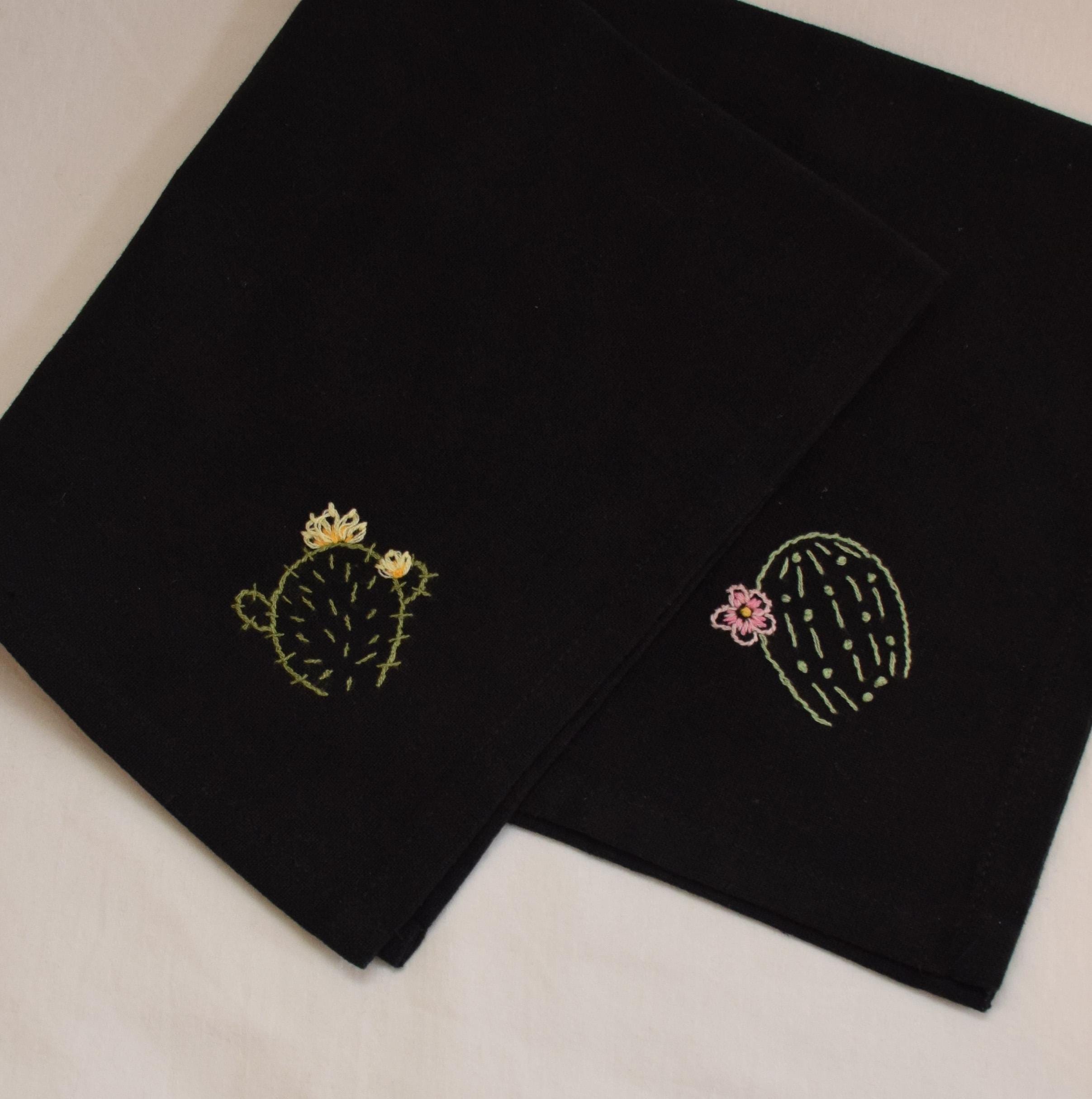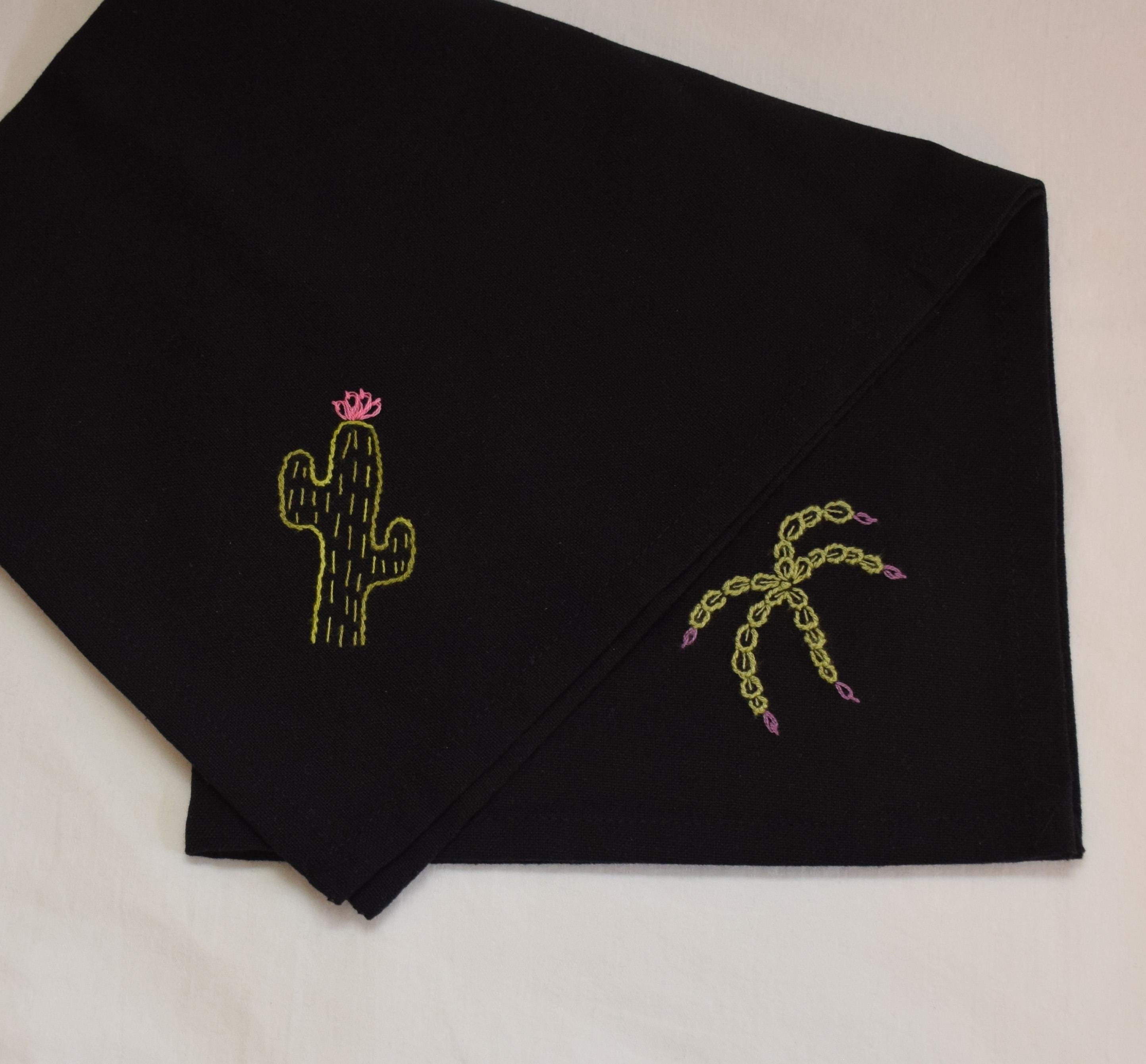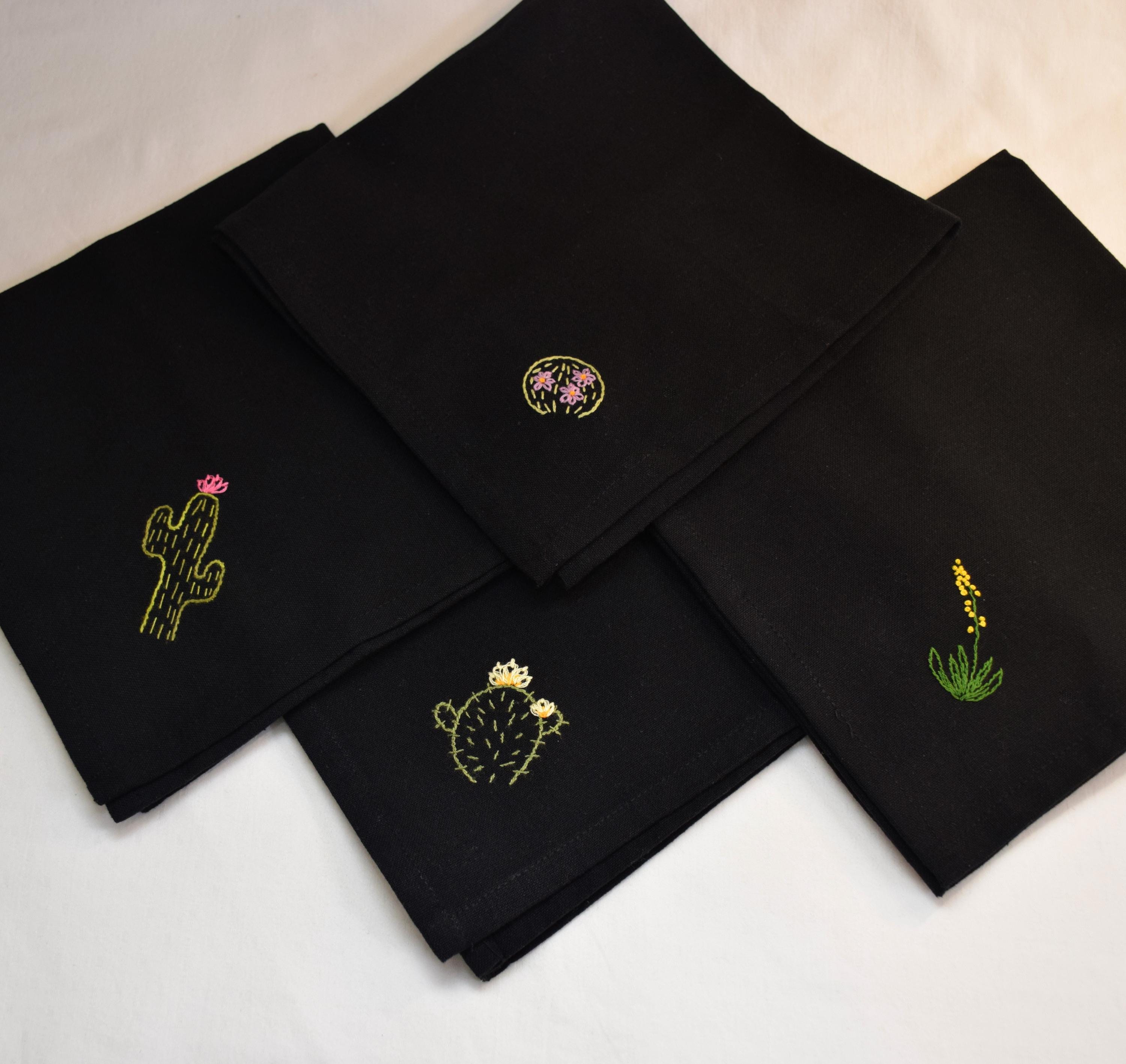 Set of 4 hand embroidered southwestern theme dinner napkins - rich black 18" square cotton napkins are adorned in two corners with different cacti.