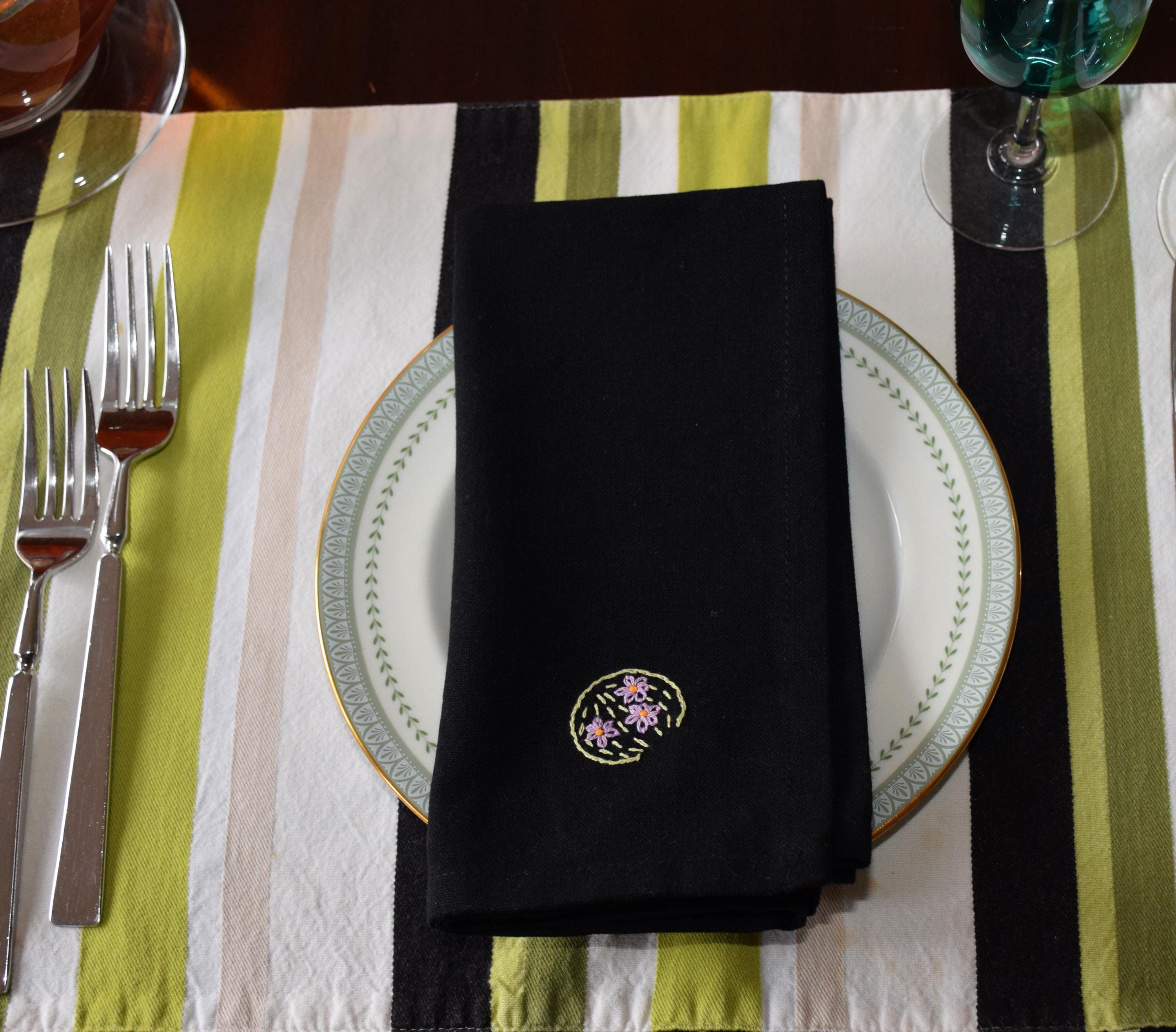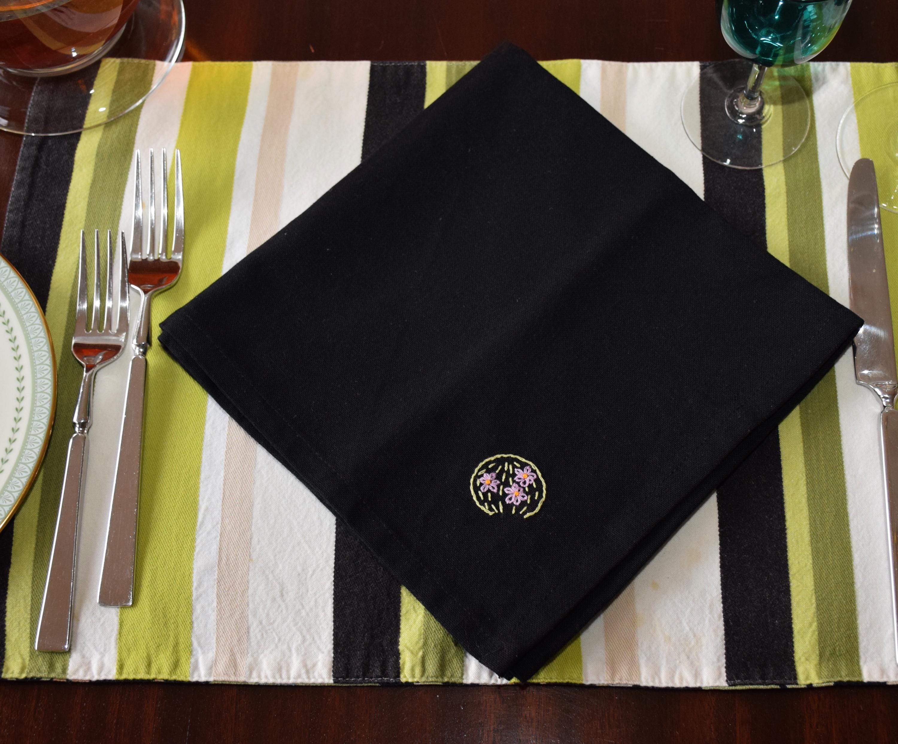 The designs are transferred to the napkins and then individually hand stitched. Because of this, there may be slight variances in the execution of the designs.