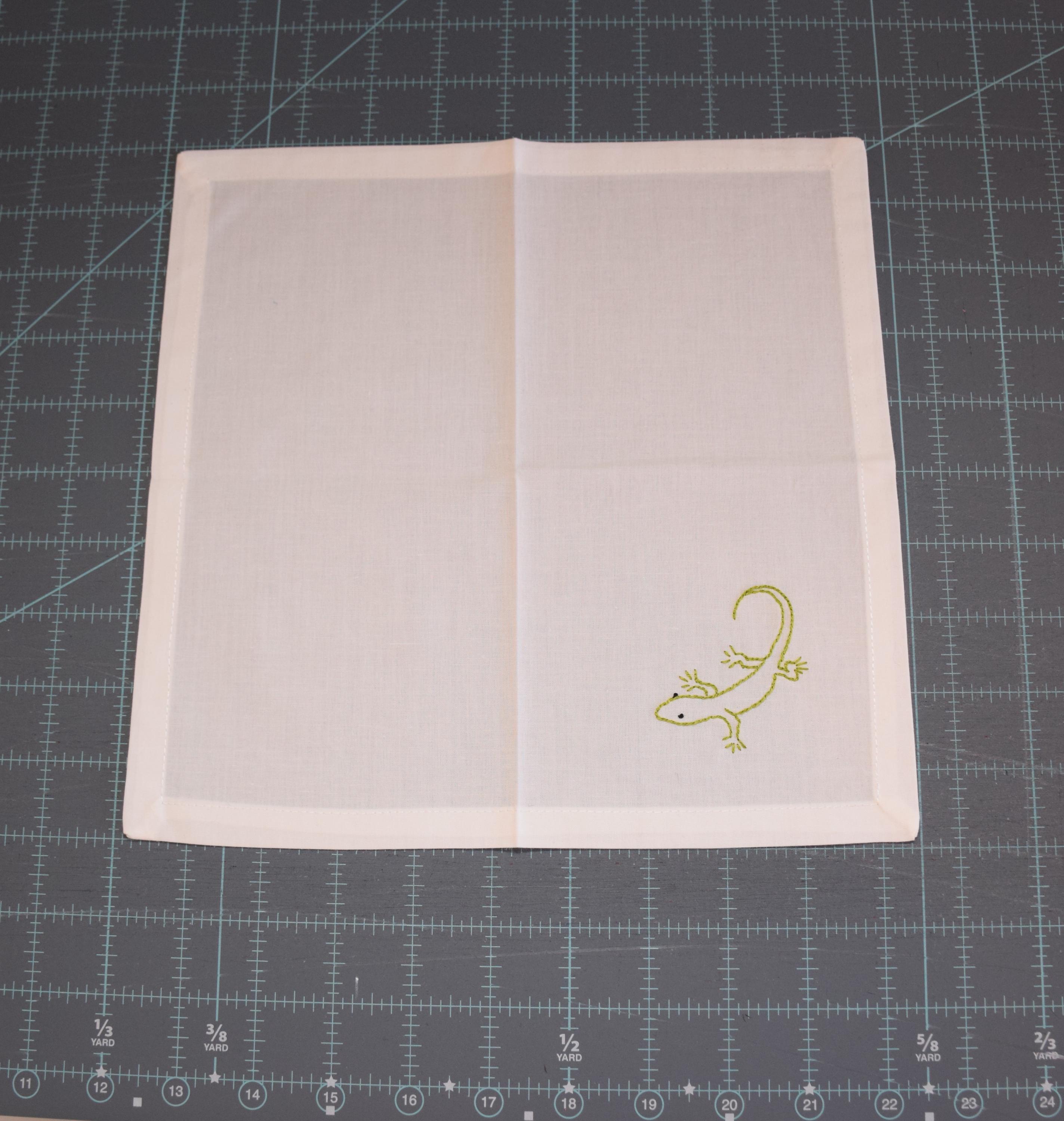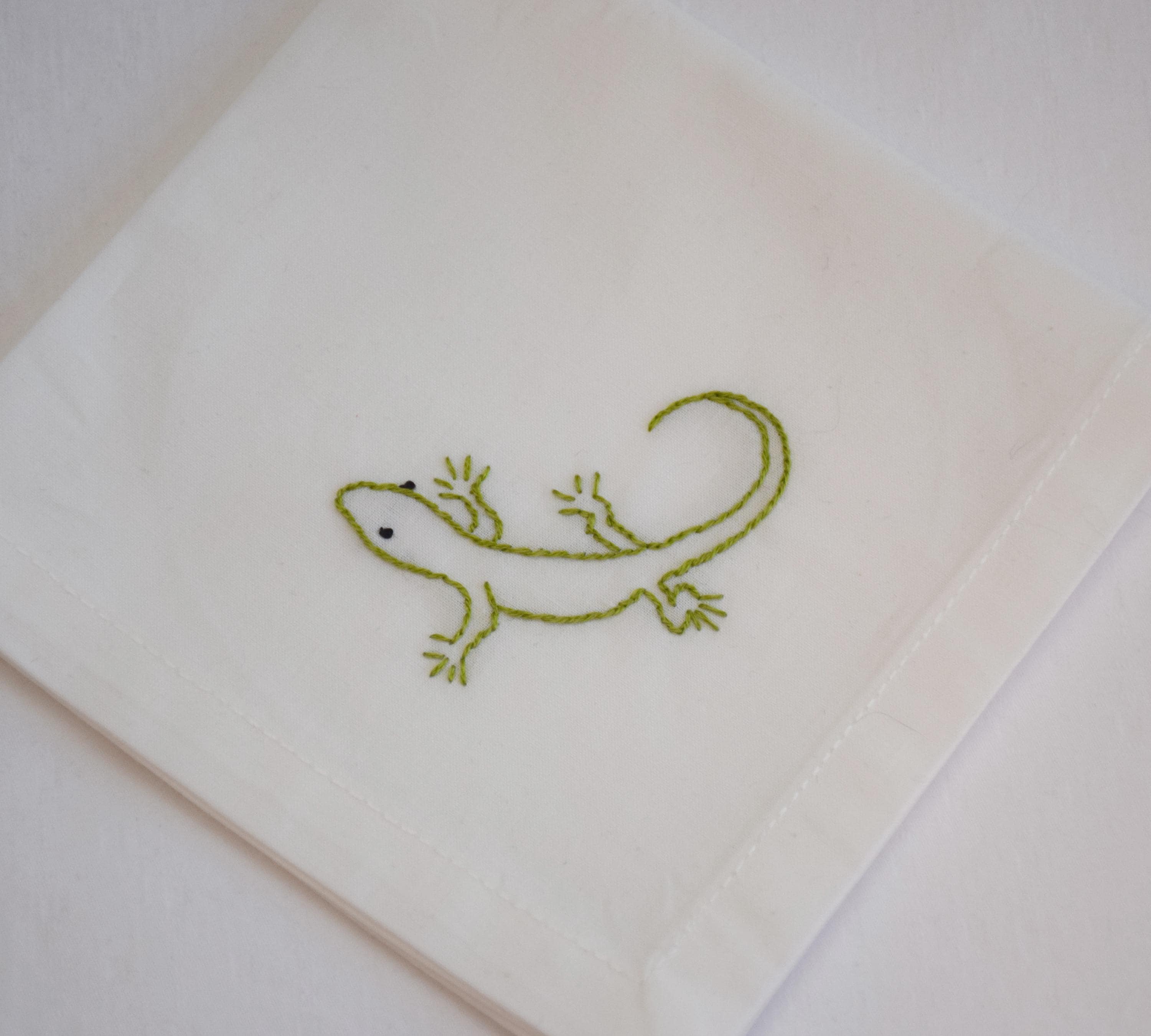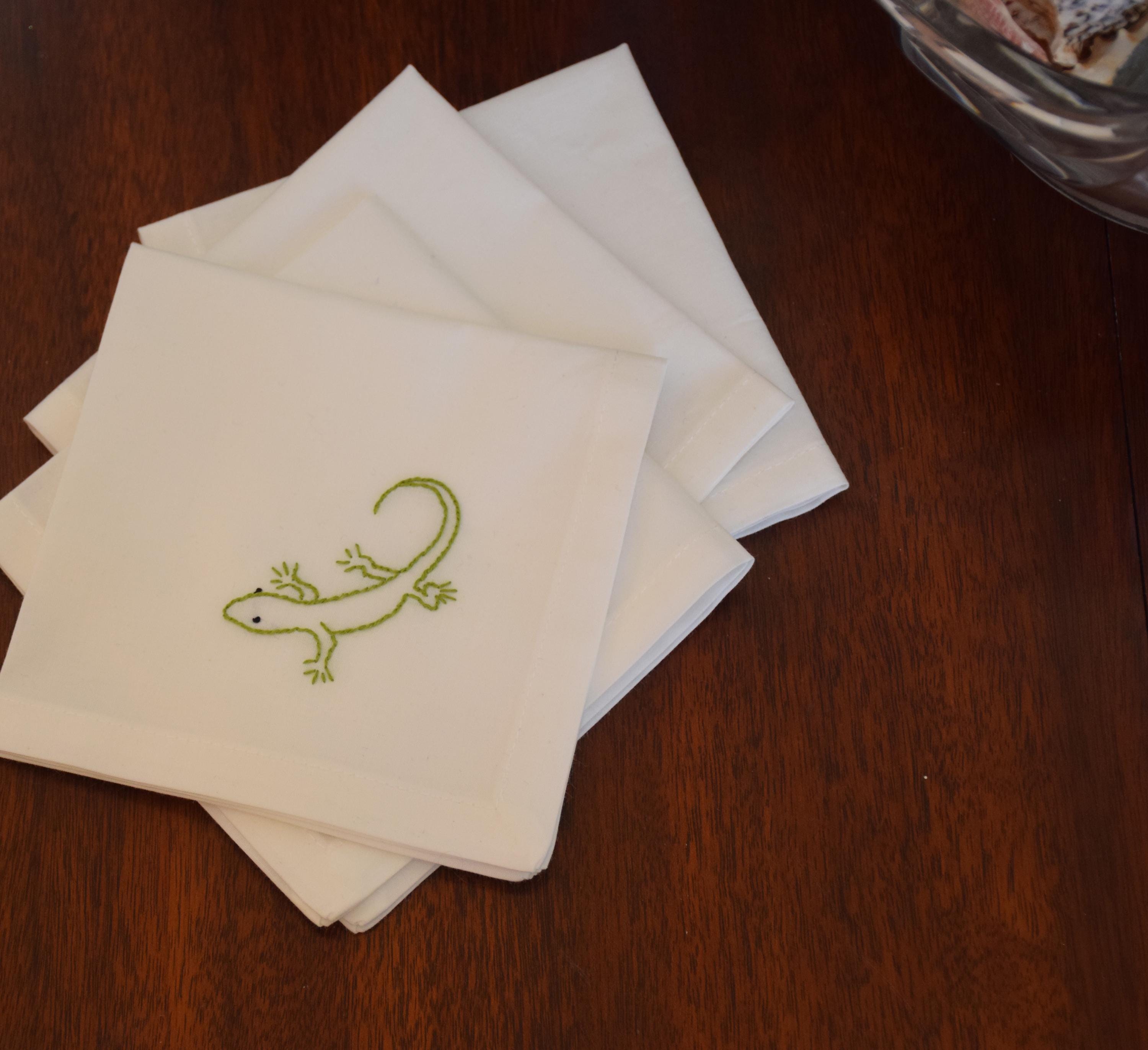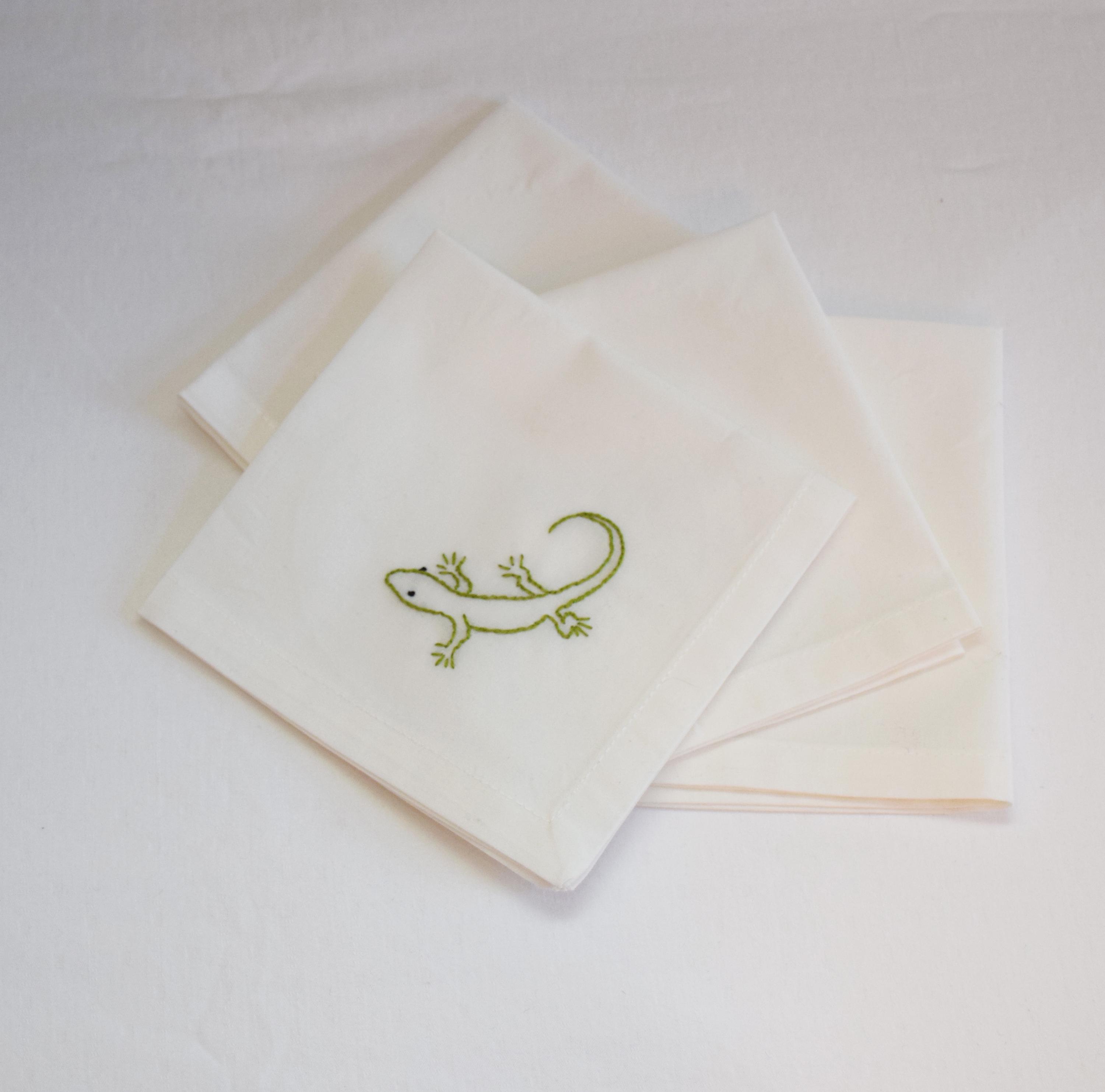 This listing is for 1 white cotton 10" x 10" or linen 6" x 6" hand embroidered cocktail napkin with a green lizard perched in one corner.