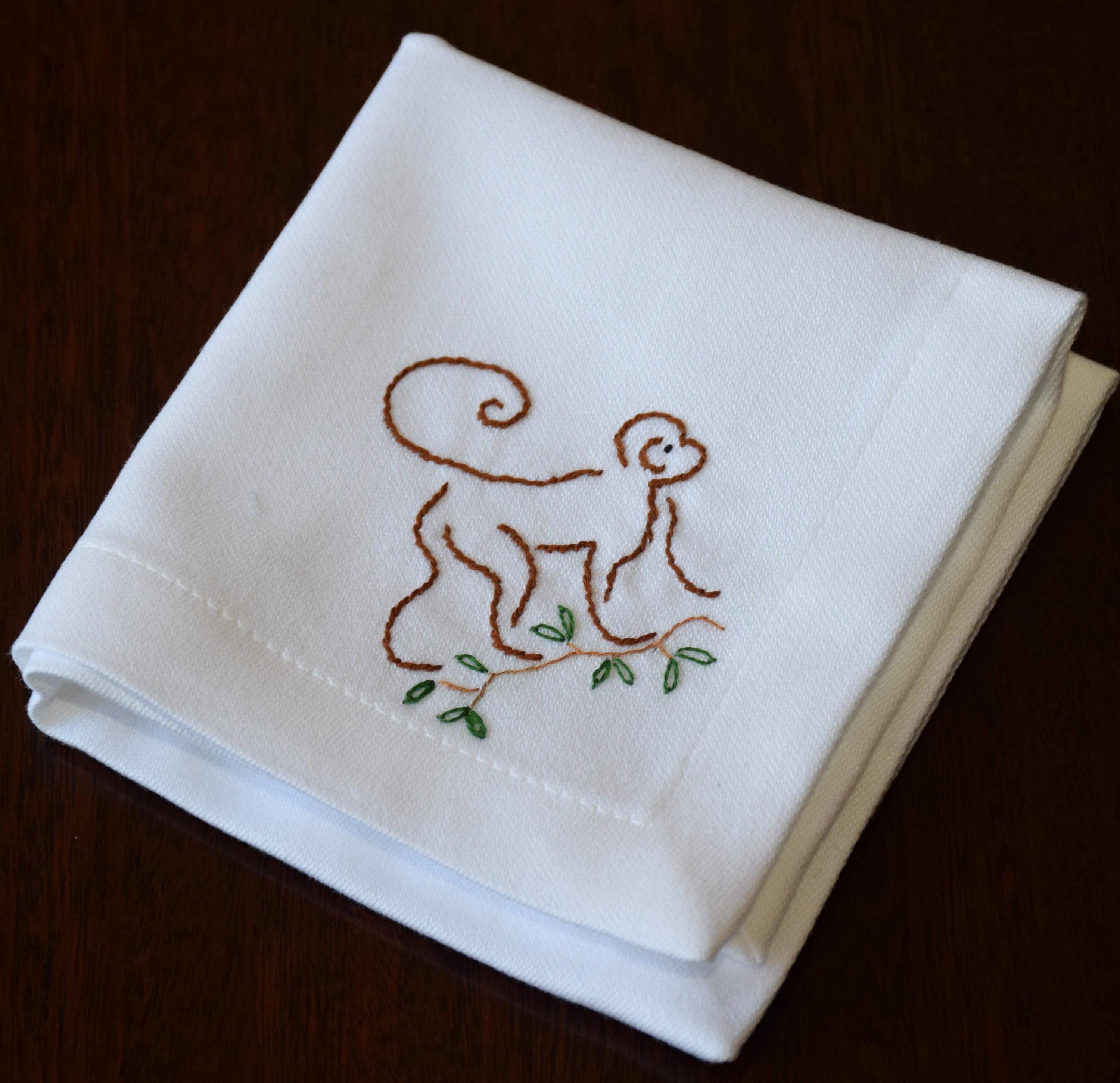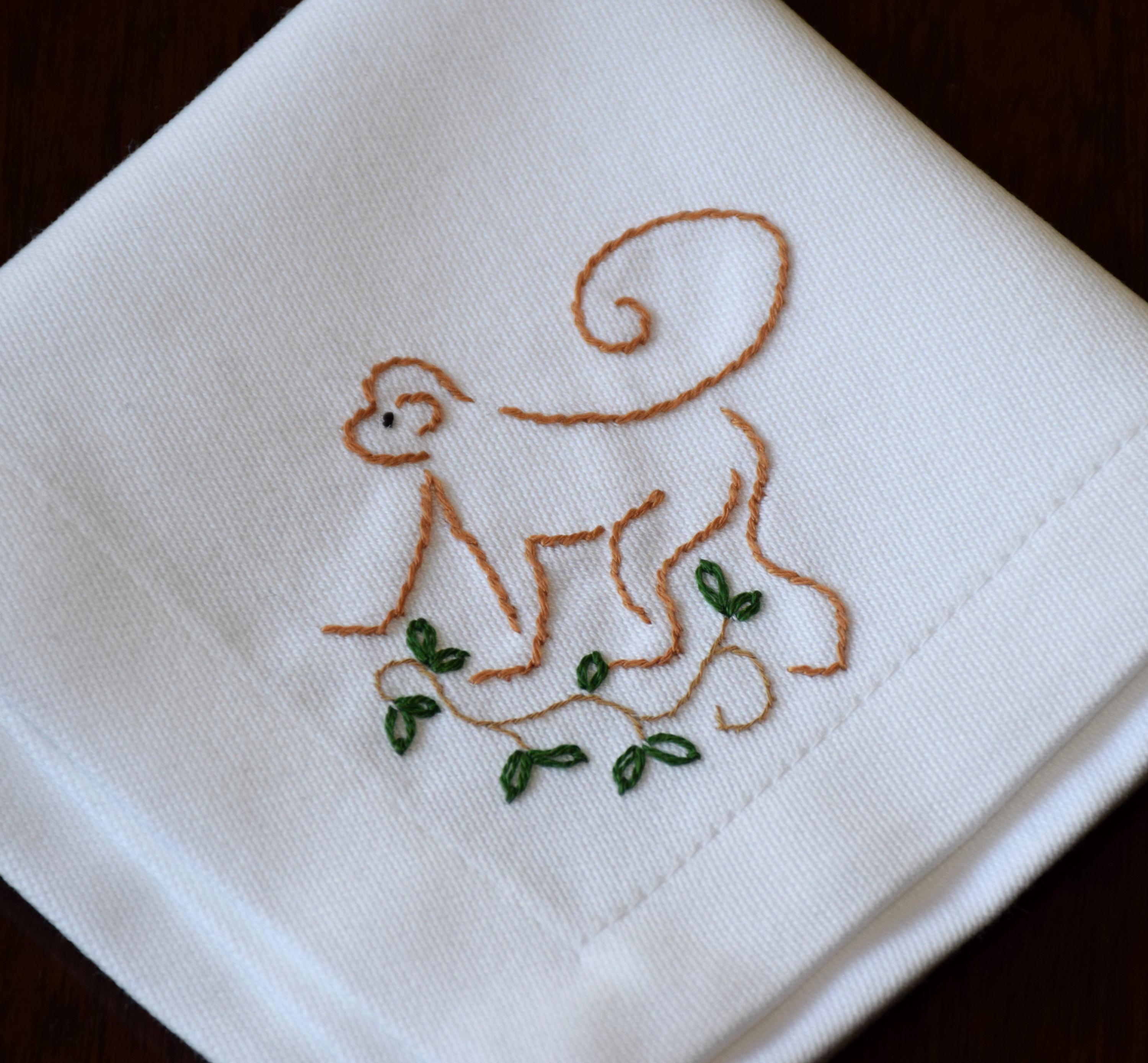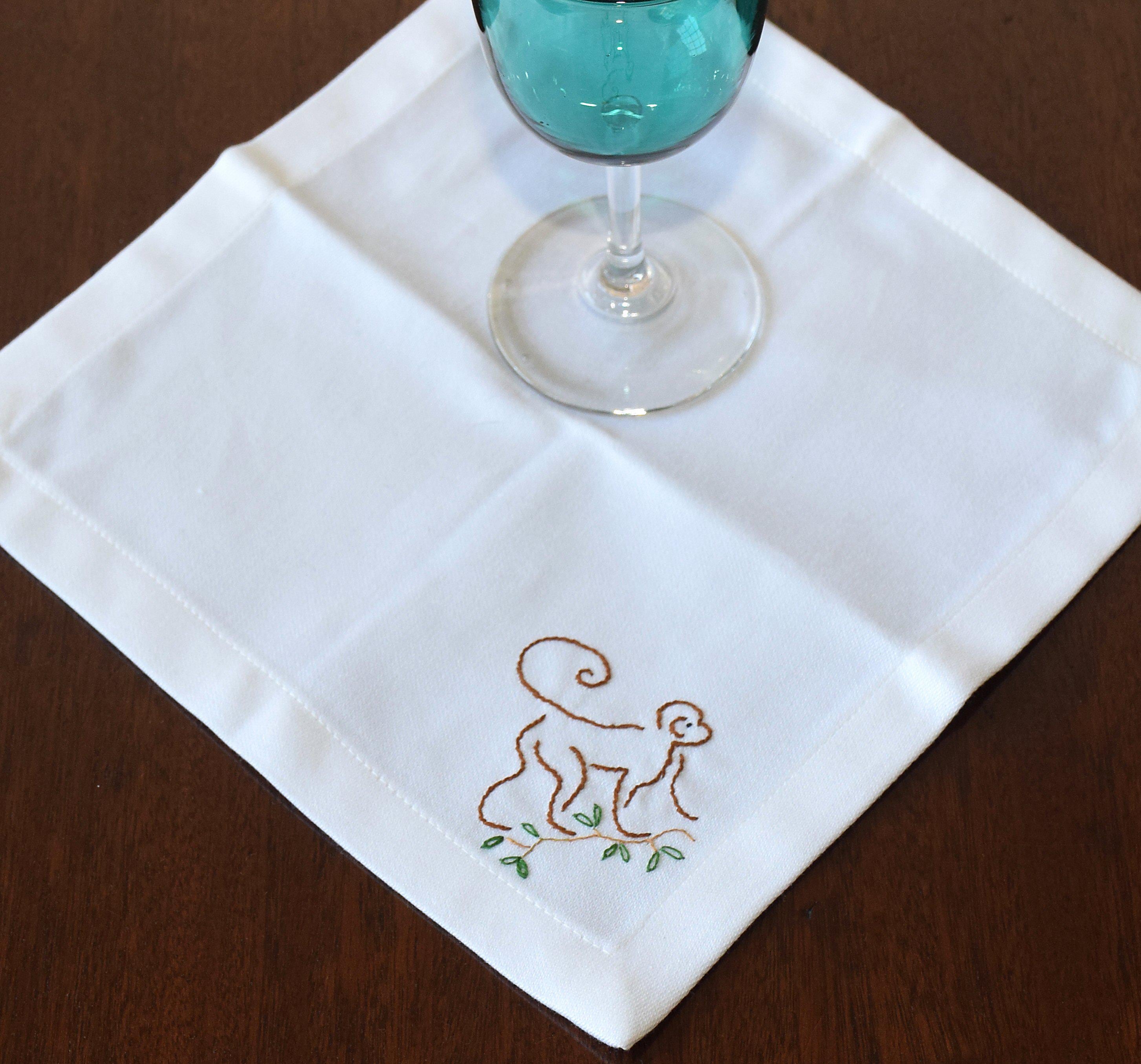One set of 4 custom hand embroidered cocktail napkins - pure white cotton cocktail napkins are adorned in the corner with a monkey scampering along a leafy branch.