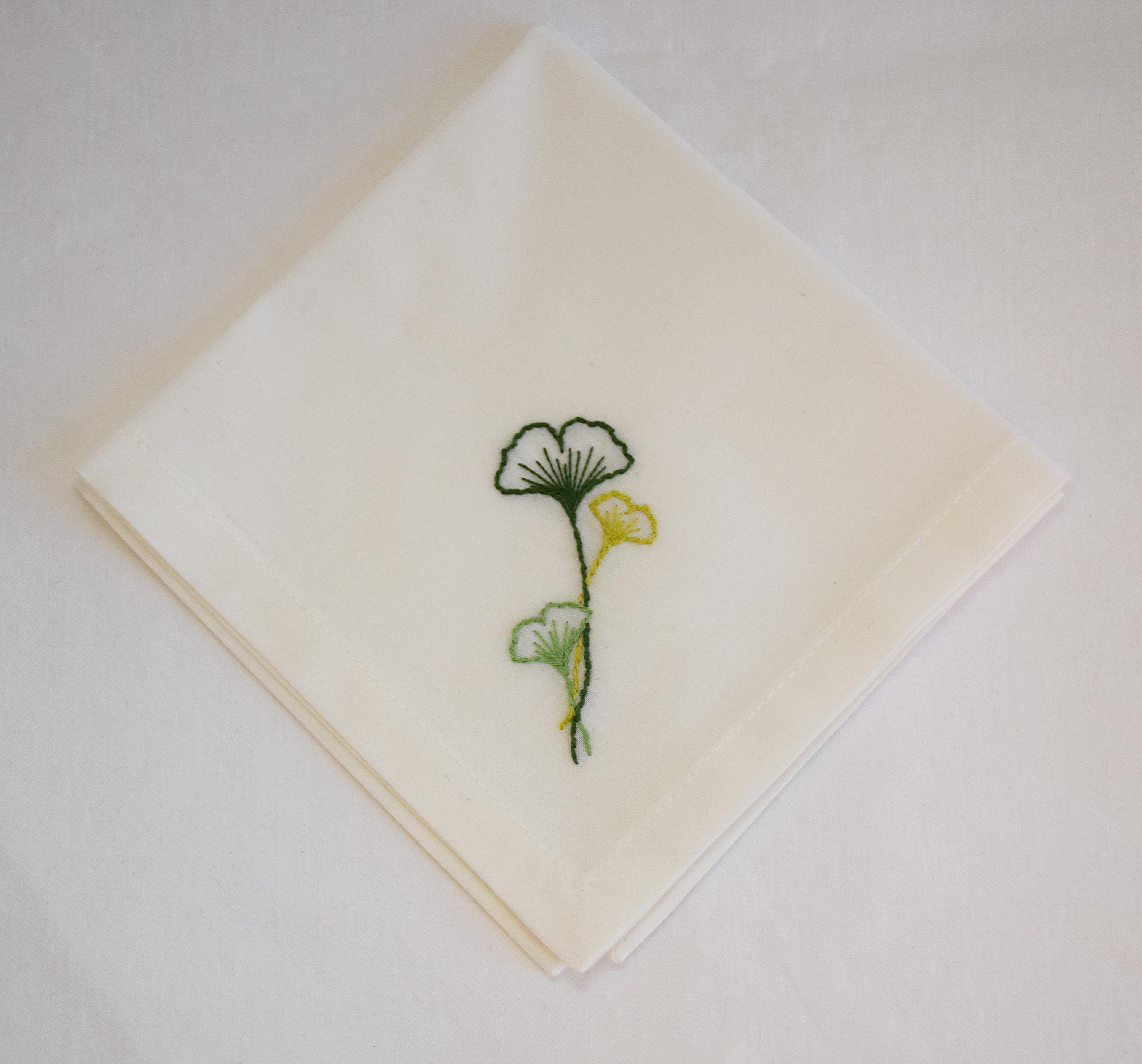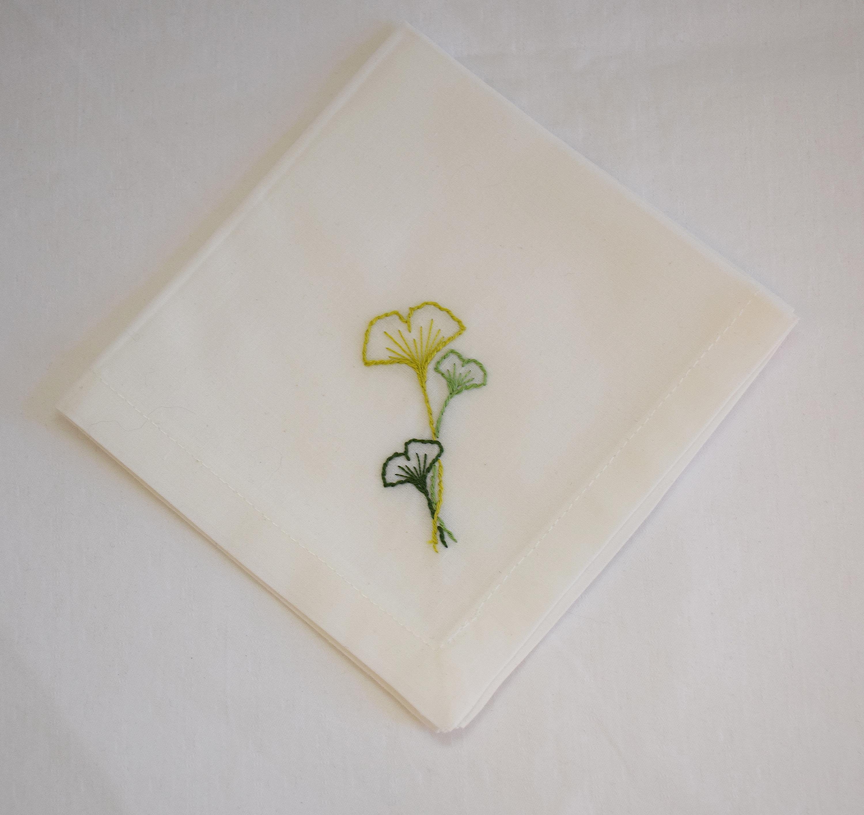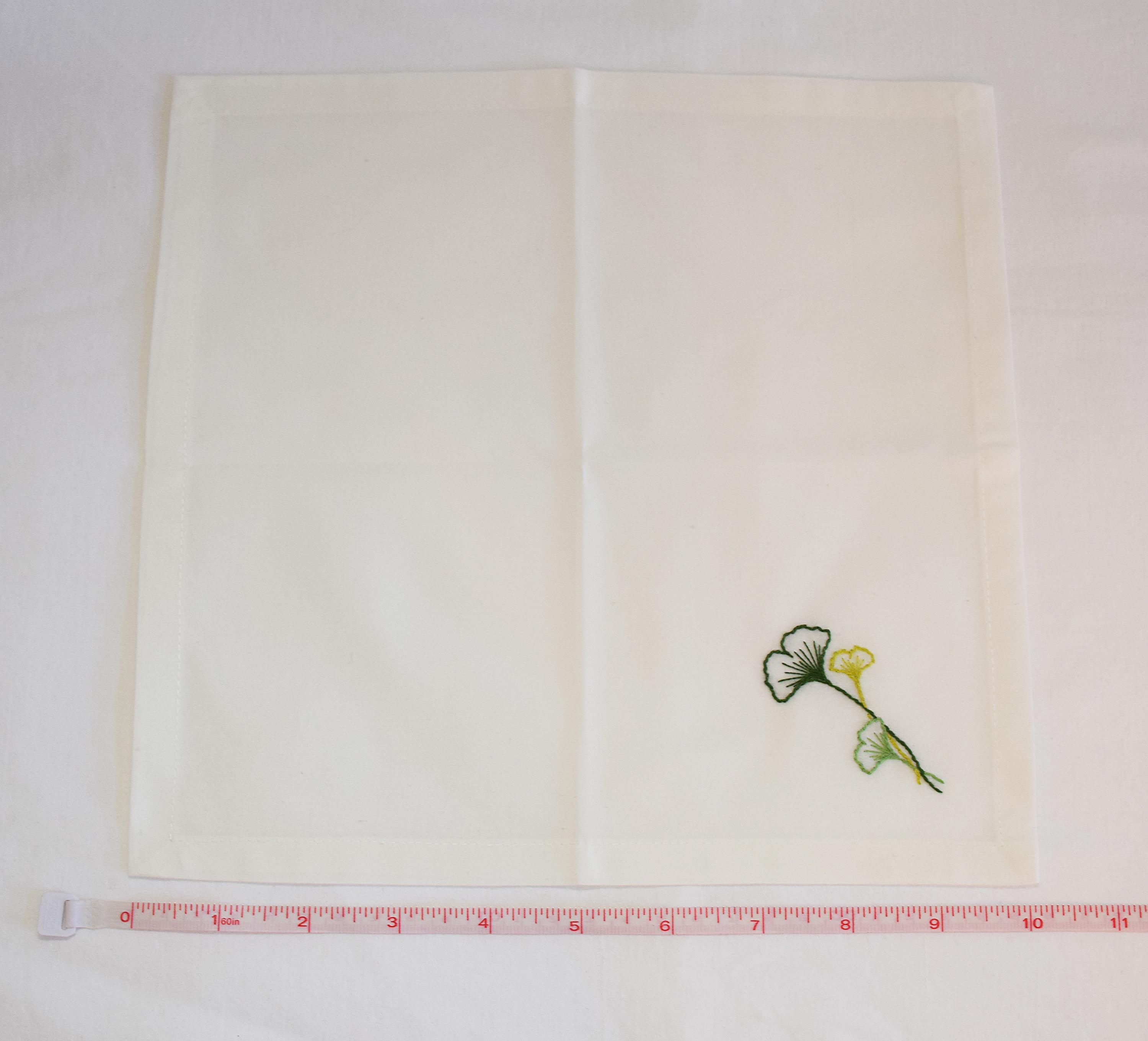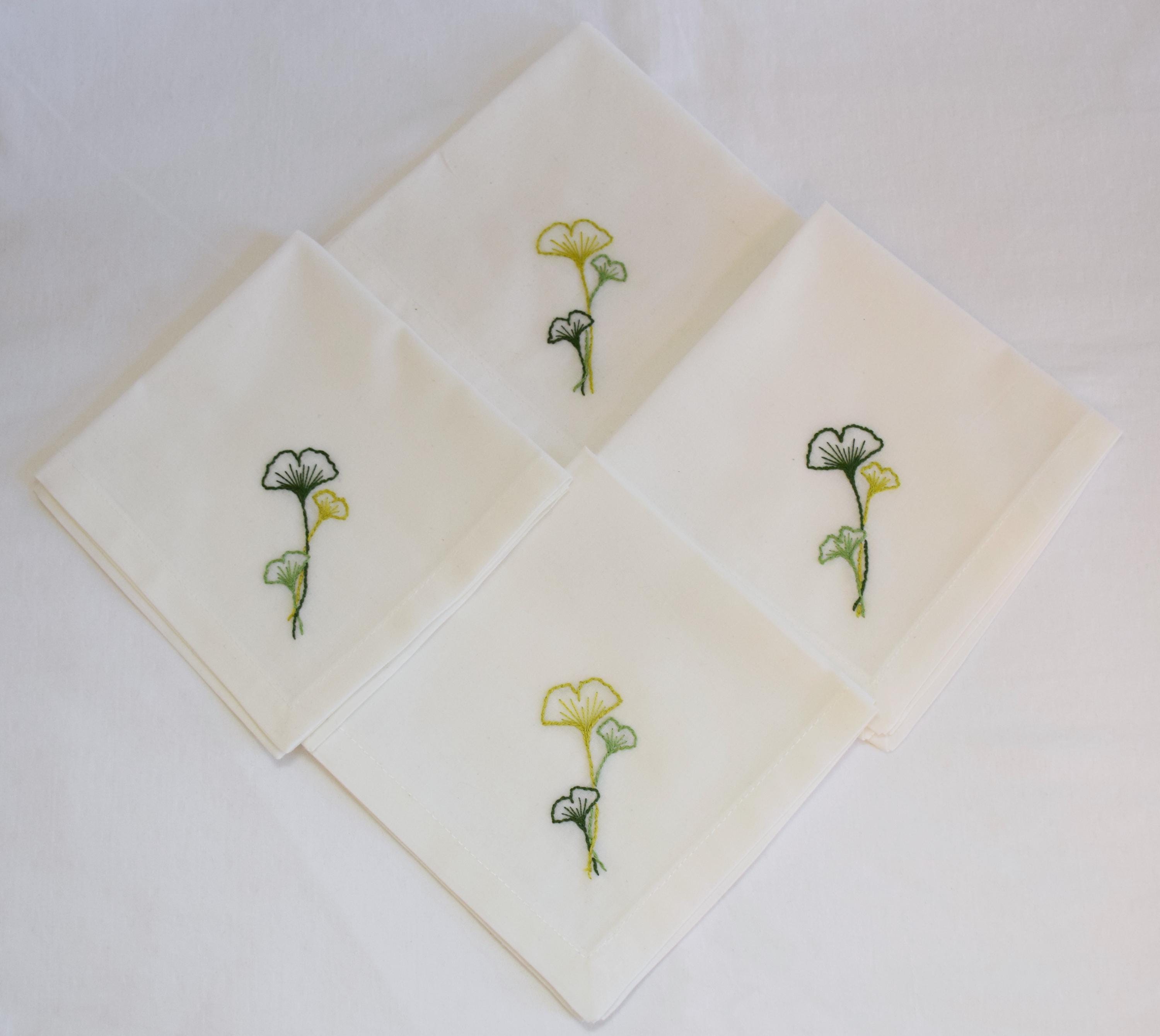 Set of 4 white cotton 10" x 10" hand embroidered ginkgo (or gingko) leaves design cocktail napkins. Ginkgo (Ginkgo biloba) is one of the oldest living tree species and its leaves have been used in Chinese and herbal medicine for hundreds of years.