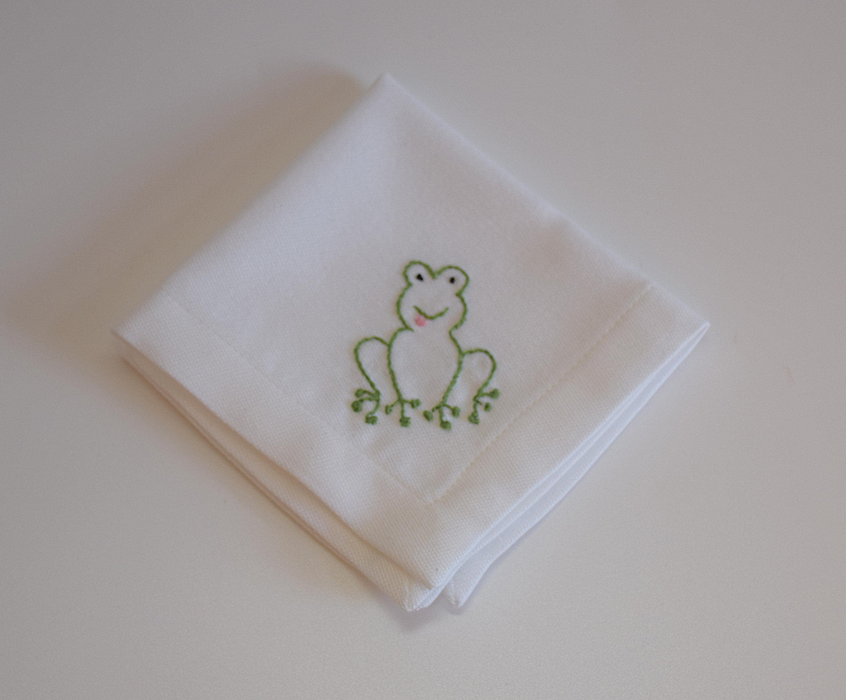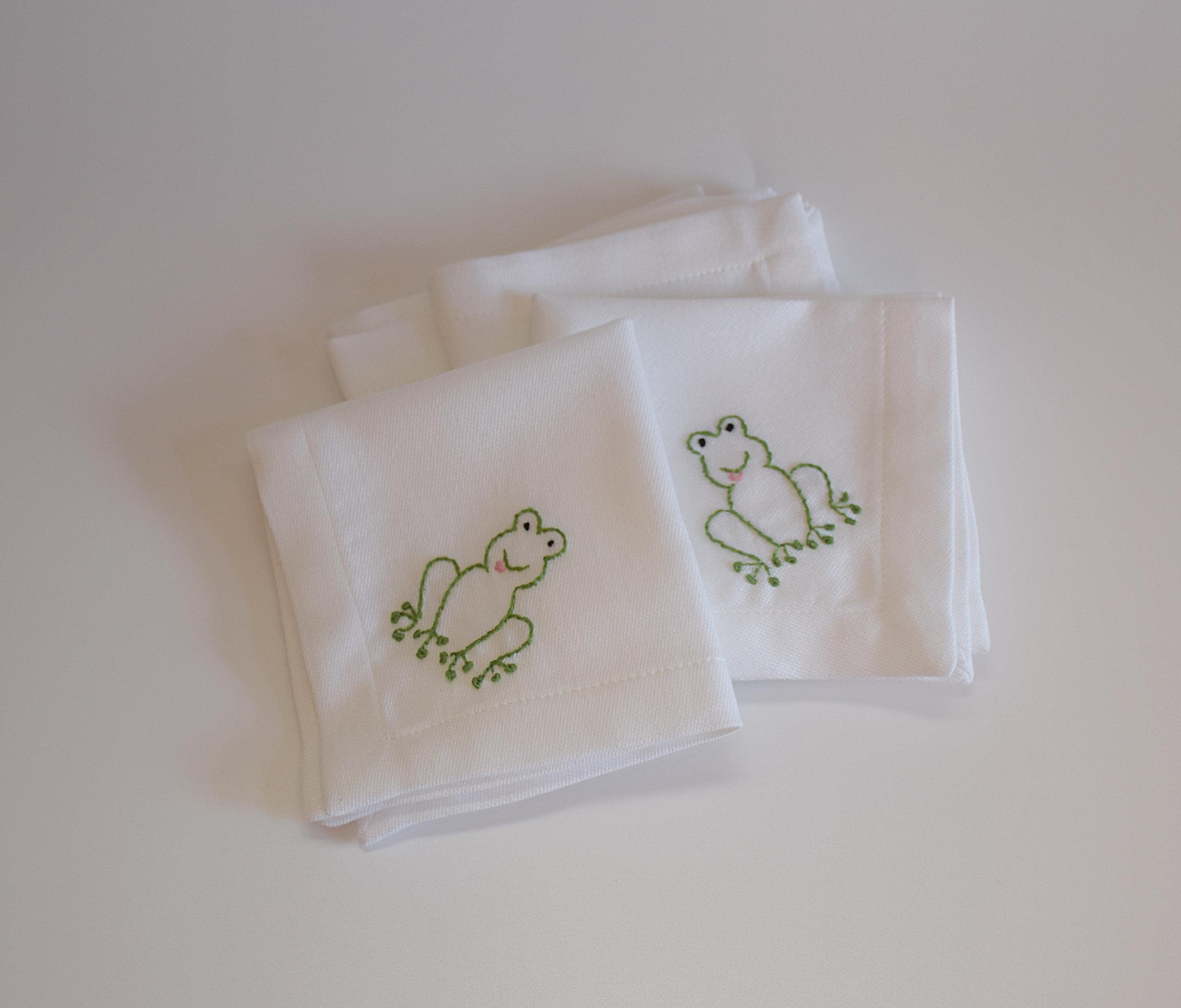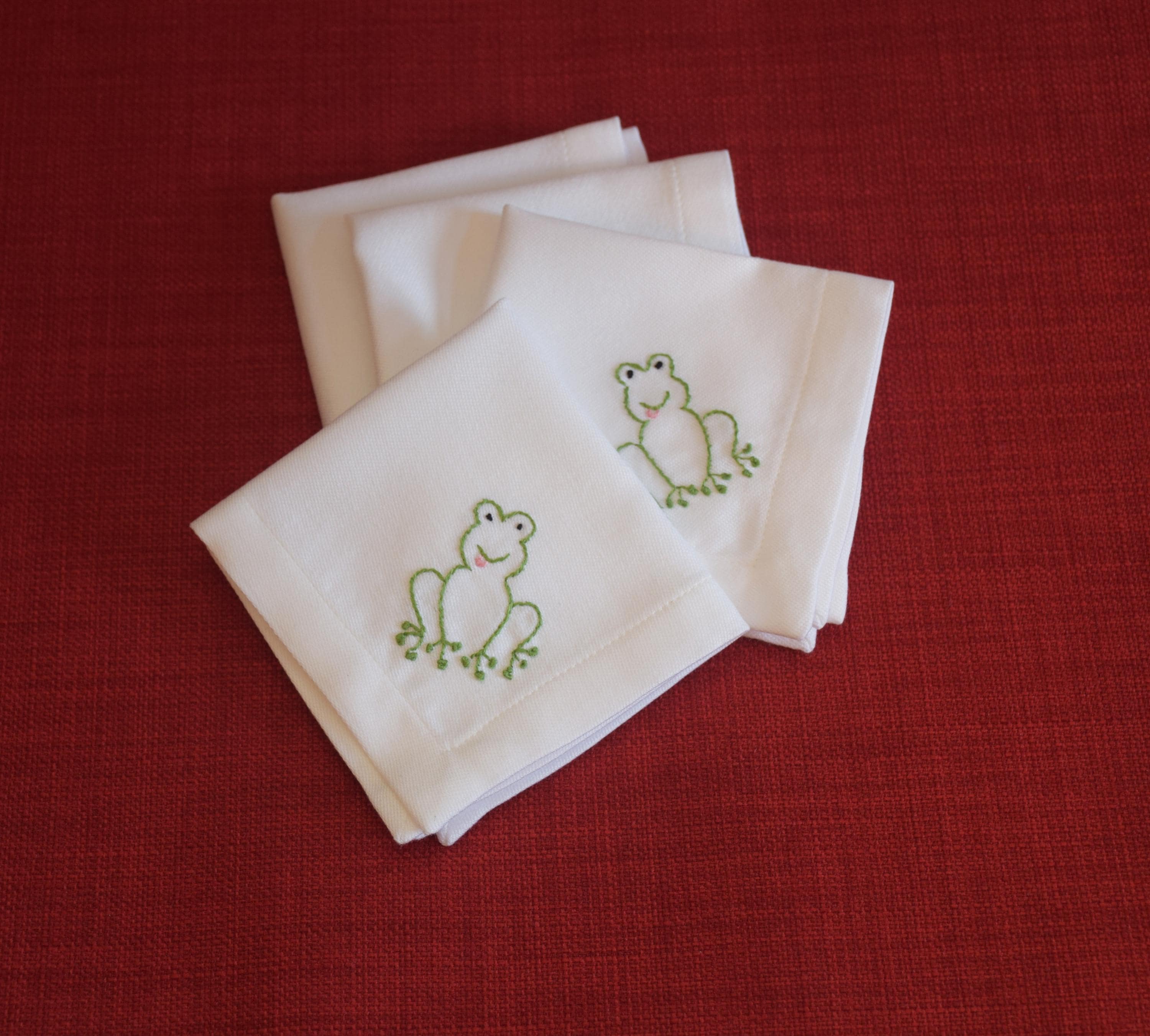 Pure white cotton cocktail napkins are adorned in the corner with a smiling green frog.