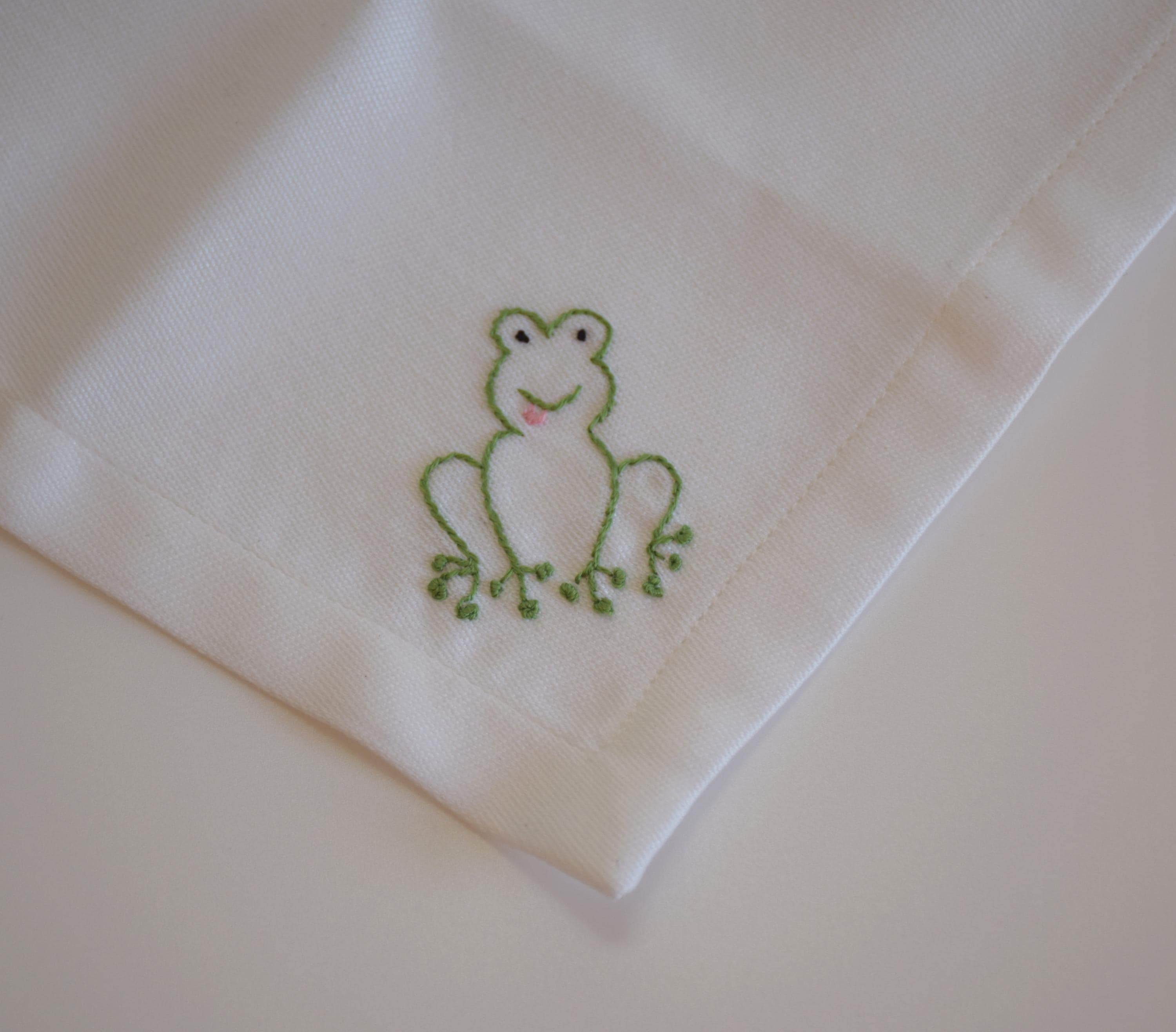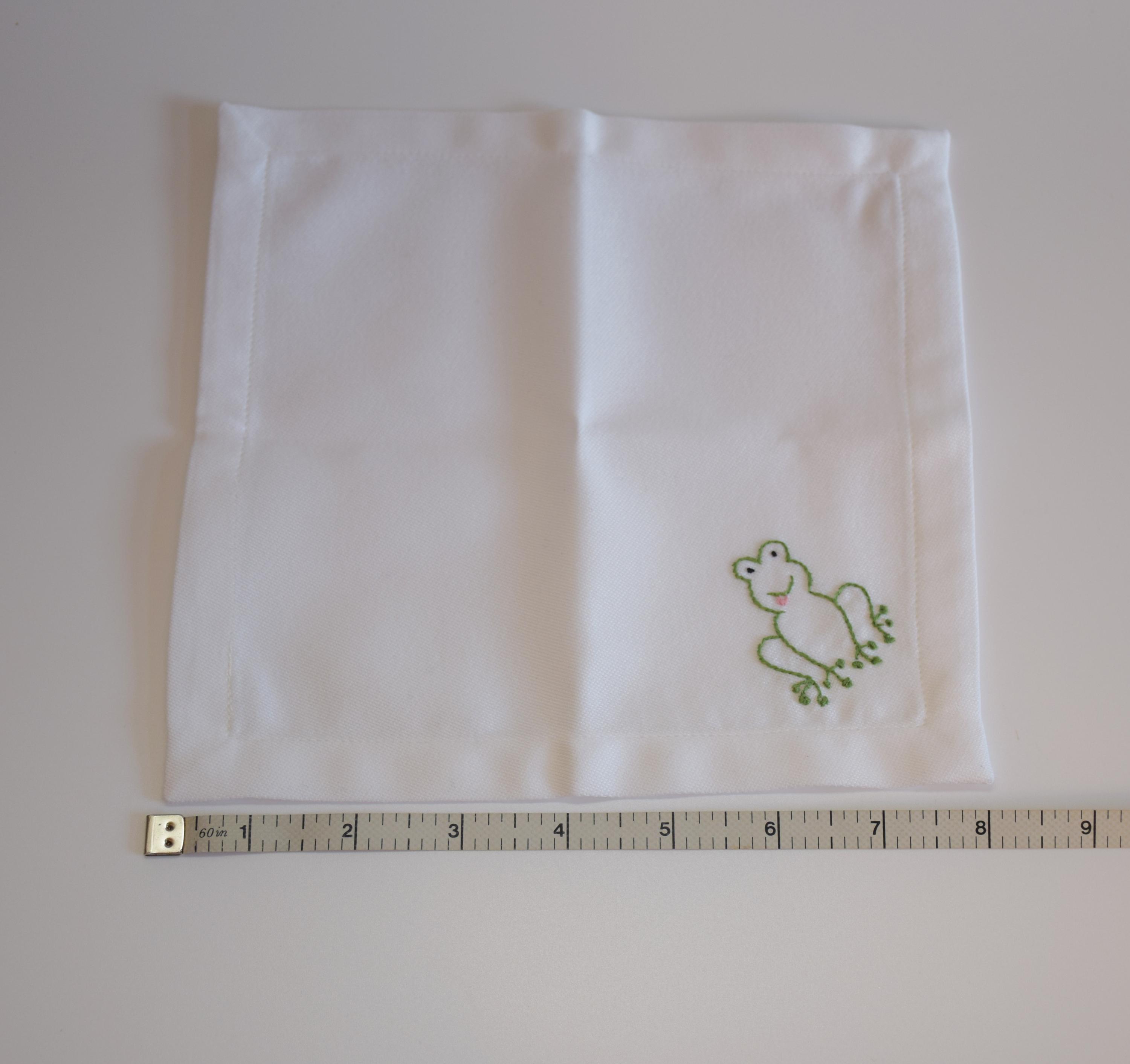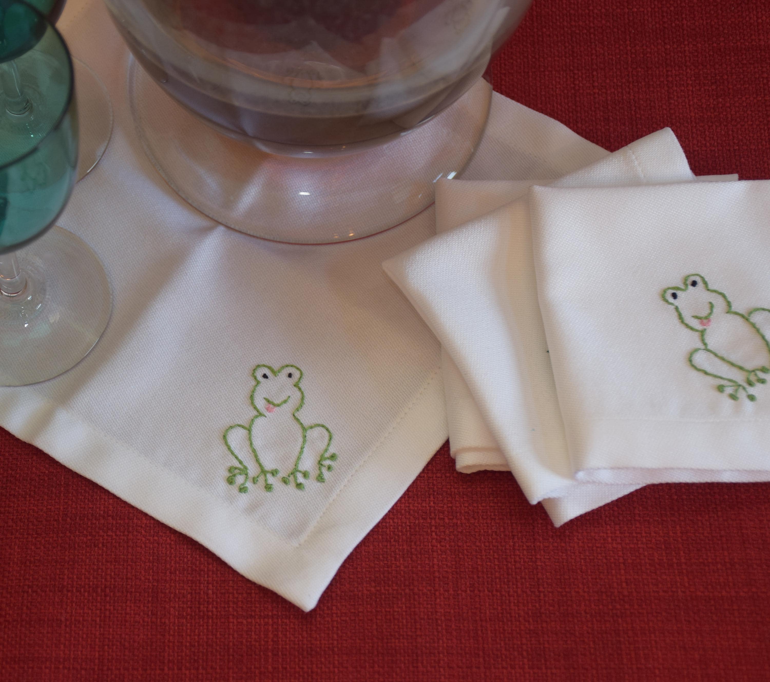 Pure white cotton cocktail napkins are adorned in the corner with a smiling green frog.